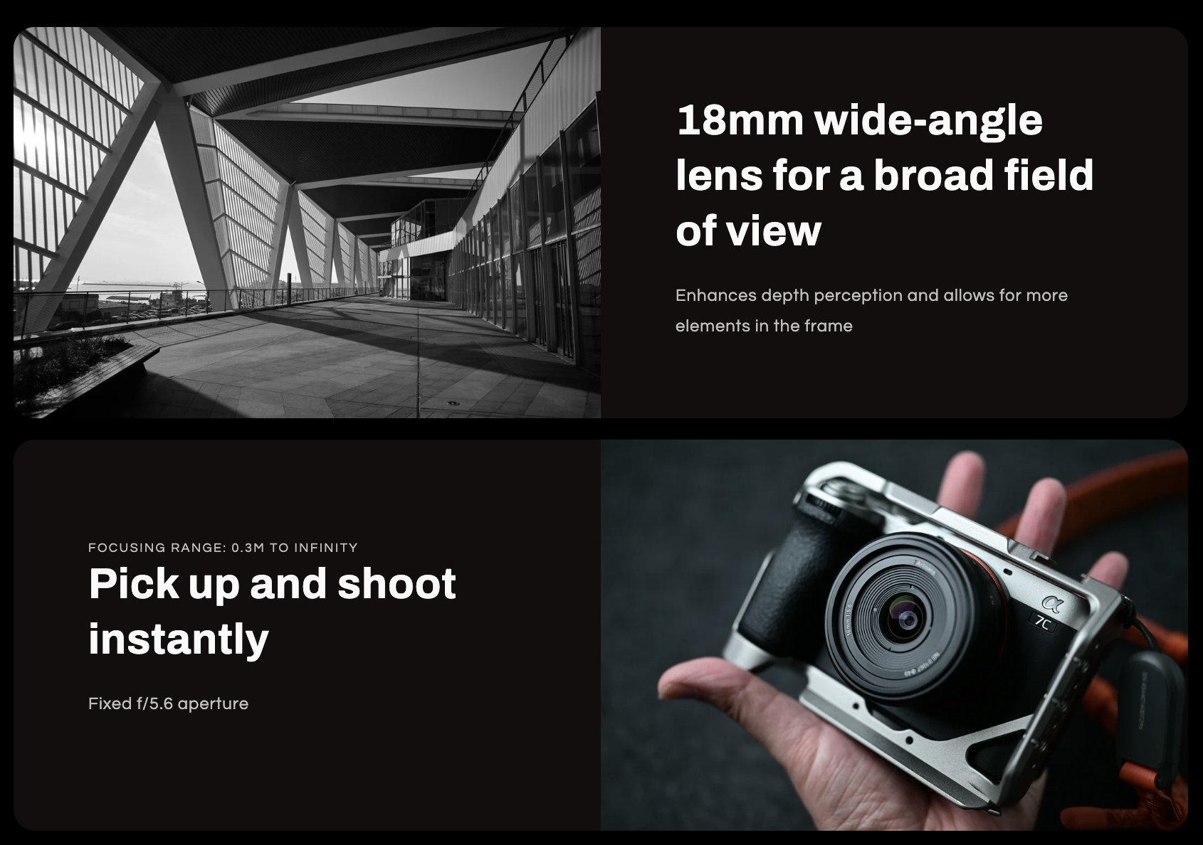 · มุมมองกว้างพิเศษสำหรับ Street และ Landscape ทางยาวโฟกัส: 18mm มุมมอง: 98.7 องศา ซึ่งเป็นระยะมุมกว้างที่สมบูรณ์แบบสำหรับการถ่ายภาพสตรีท (Street Photography), สารคดี (Documentary) และวิวทิวทัศน์ (Landscape) ที่ต้องการมุมมองที่เปิดกว้าง