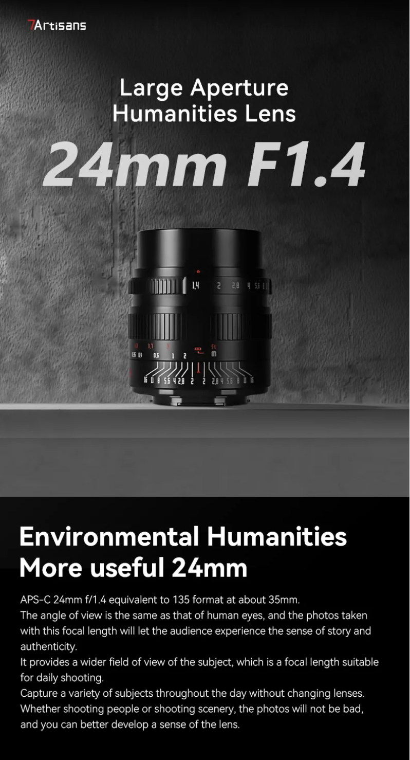·มุมมองยอดนิยม (Classic 35mm Equivalent): ทางยาวโฟกัส 24mm บนเซนเซอร์ APS-C จะให้มุมมองที่เทียบเท่ากับประมาณ 35mm บนกล้องฟูลเฟรม ซึ่งเป็นมุมมอง "ตามาตรฐาน" ที่ได้รับความนิยมสูงสุดสำหรับการถ่ายภาพสตรีท ท่องเที่ยว และสารคดี