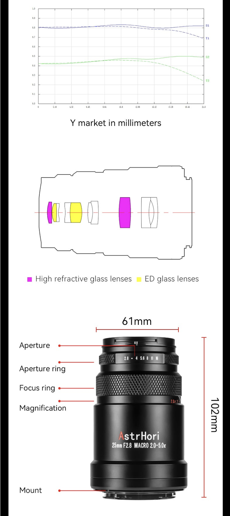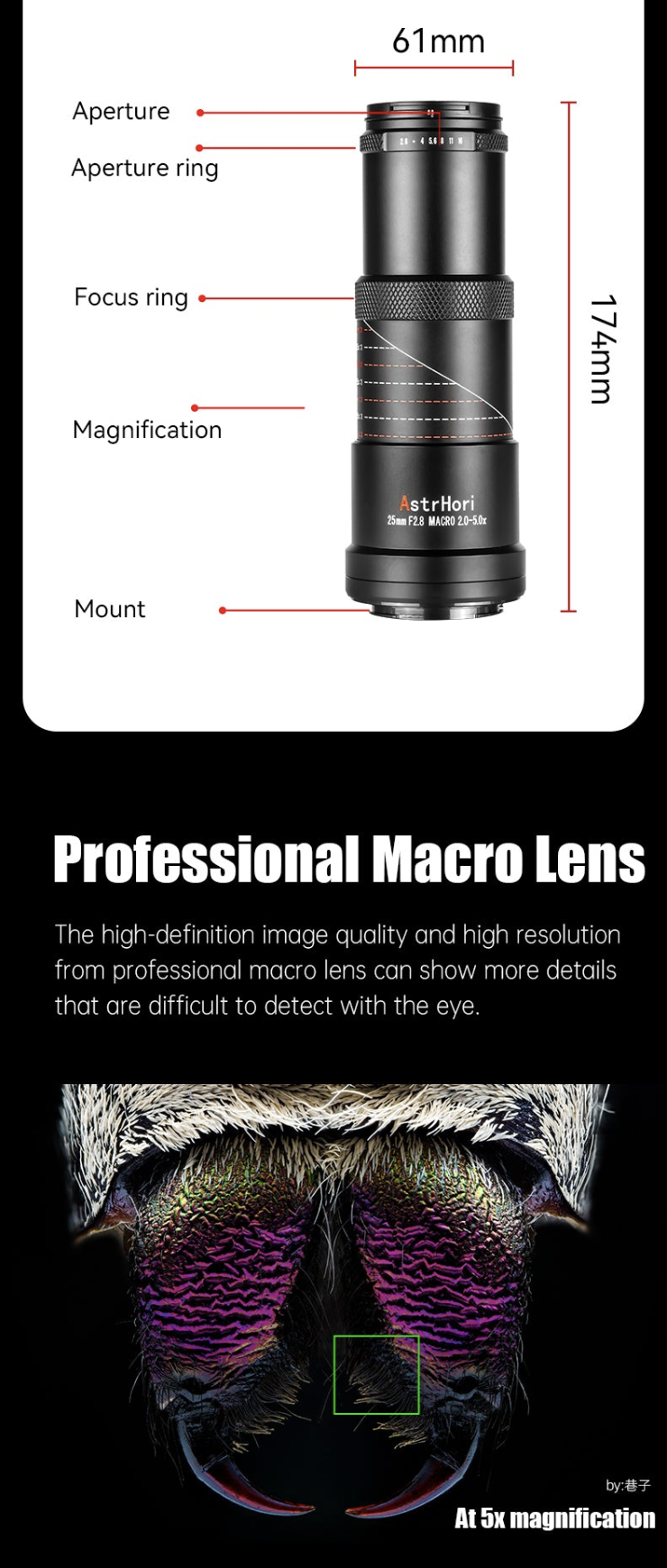 · กำลังขยายสูงสุด 5:1 (5 เท่า) เป็นเลนส์ที่ให้กำลังขยายภาพใหญ่กว่าวัตถุจริงได้ถึง 5 เท่า! (ปกติเลนส์มาโครทั่วไปคือ 1:1) เปิดประตูสู่โลกใบจิ๋วที่ไม่สามารถมองเห็นด้วยตาเปล่าได้อย่างชัดเจน