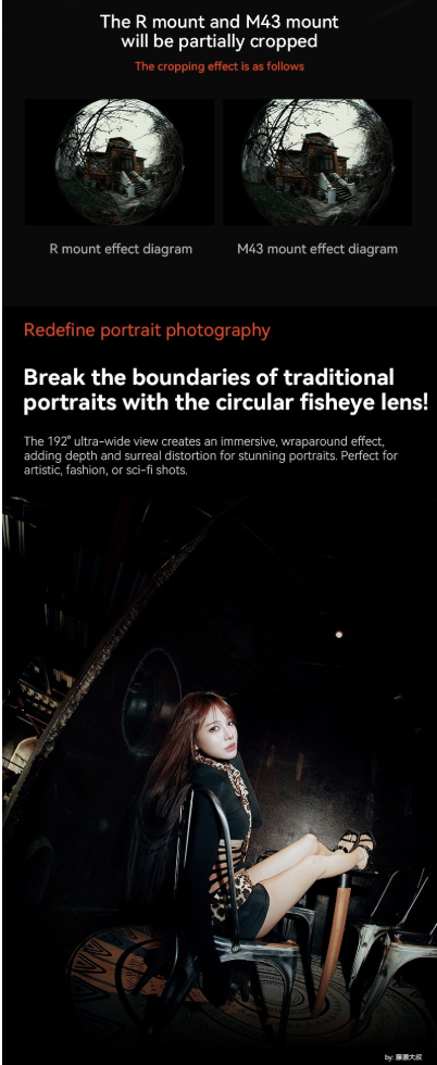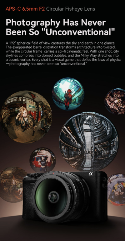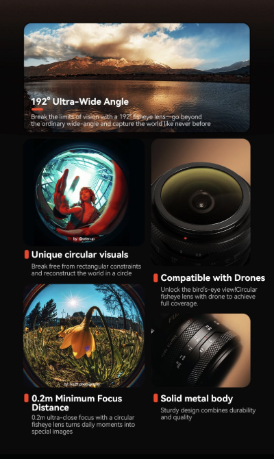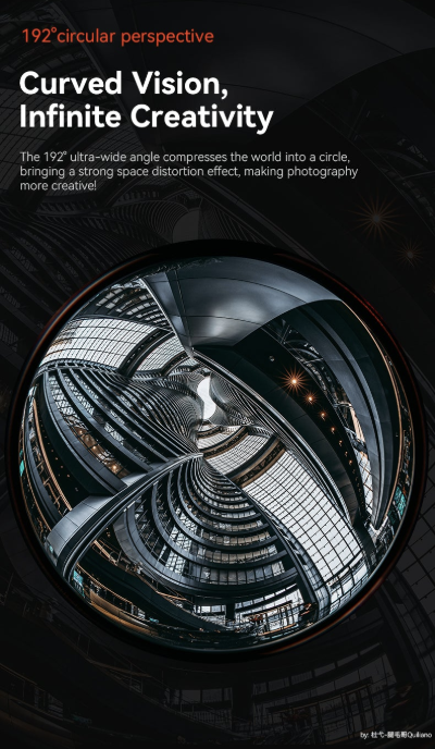 · มุมมองสุดขอบโลก 192°: ให้มุมมอง Circular Fisheye (ภาพกลม/โค้ง) ที่กว้างถึง 192 องศา ซึ่งกว้างกว่าเลนส์ฟิชอายทั่วไป สร้างภาพที่มีมิติความโค้งและ เอฟเฟกต์ภาพยืดที่น่าตื่นตาตื่นใจ เหมาะสำหรับงานสร้างสรรค์, สเก็ตบอร์ด/กีฬาแนว Extreme, และ Vlogging