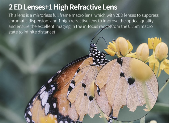 · มาโคร 1:1 แท้ (True Macro) ให้กำลังขยายภาพเท่าขนาดวัตถุจริง (Ratio 1:1) สามารถจับรายละเอียดเล็กๆ ได้อย่างคมชัด เหมาะสำหรับถ่ายภาพมาโคร, เหรียญ, แมลง, และภาพสินค้า