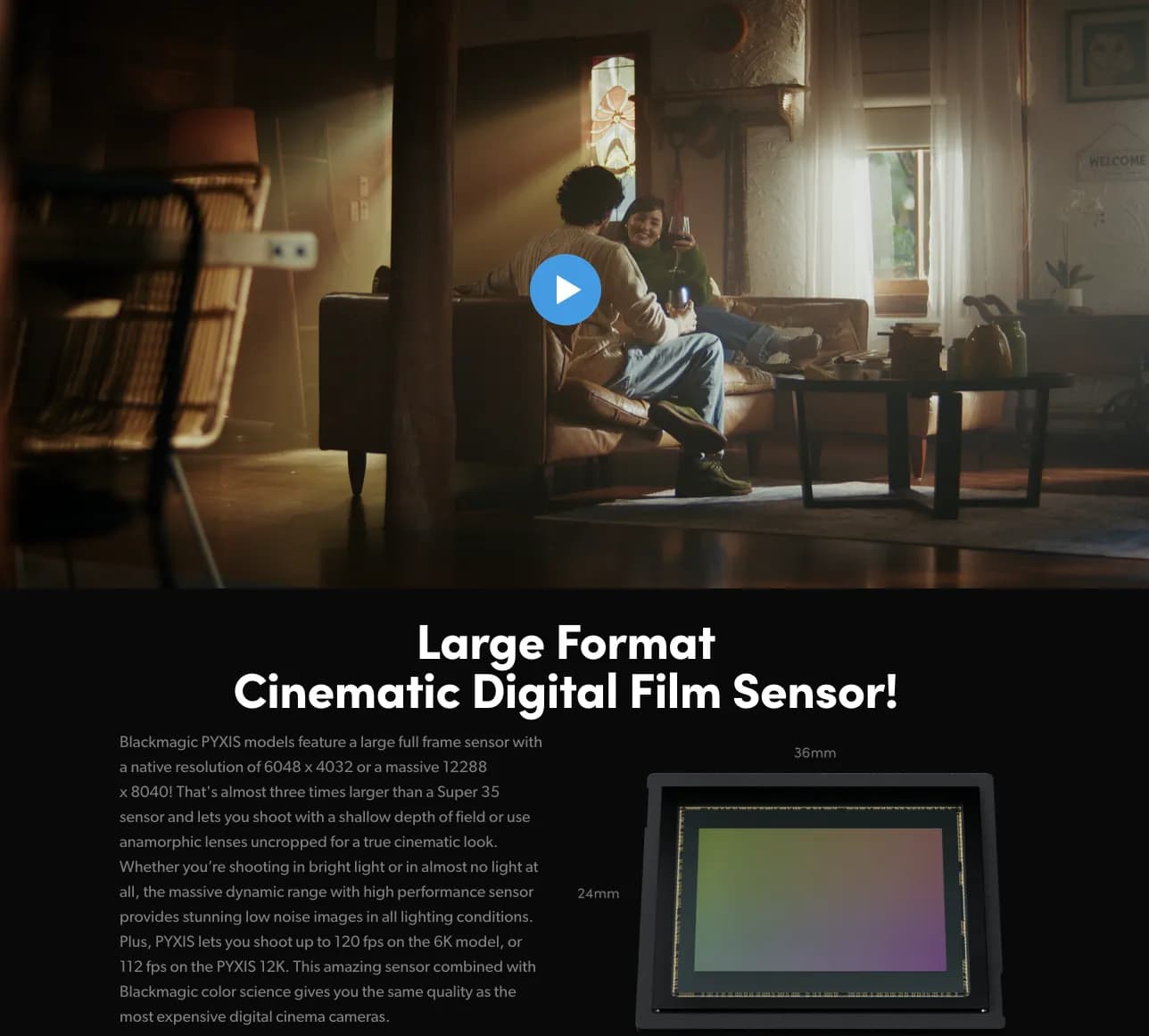 · เซนเซอร์ฟูลเฟรม แบบ RGBW ขนาด 36 x 24 มม. ความละเอียด 12K (12288 x 8040) ให้รายละเอียดสูงสุด คมชัดสมจริง สีสันเที่ยงตรง