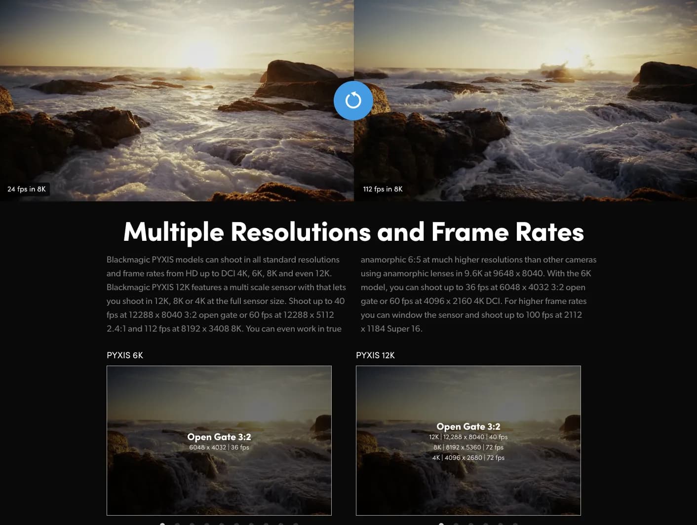 · รองรับการบันทึกความละเอียดและอัตราเฟรมสูง เช่น 12K ถึง 40 fps, 8K/4K สูงสุดถึง 112 fps (แล้วแต่โหมด)