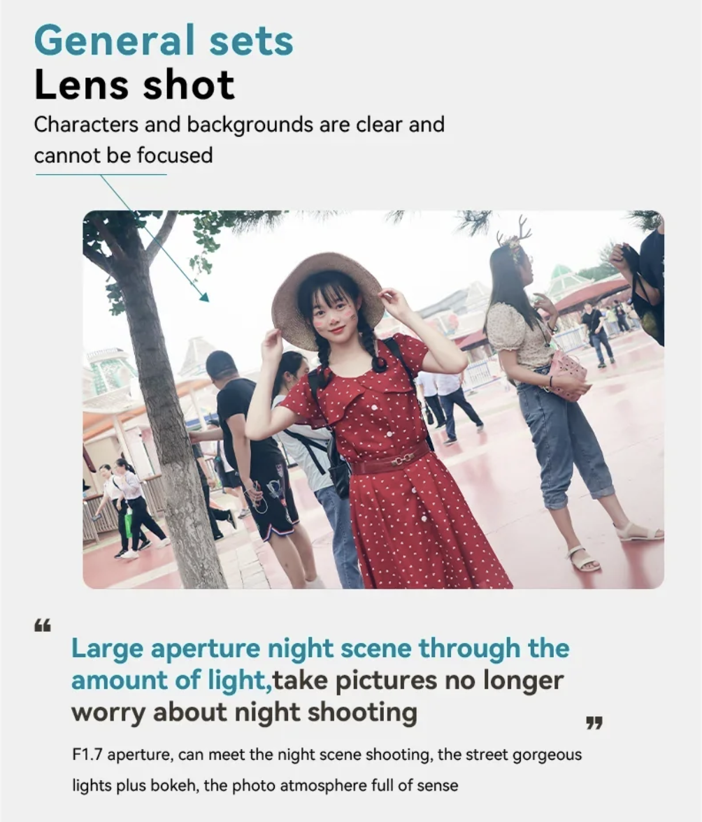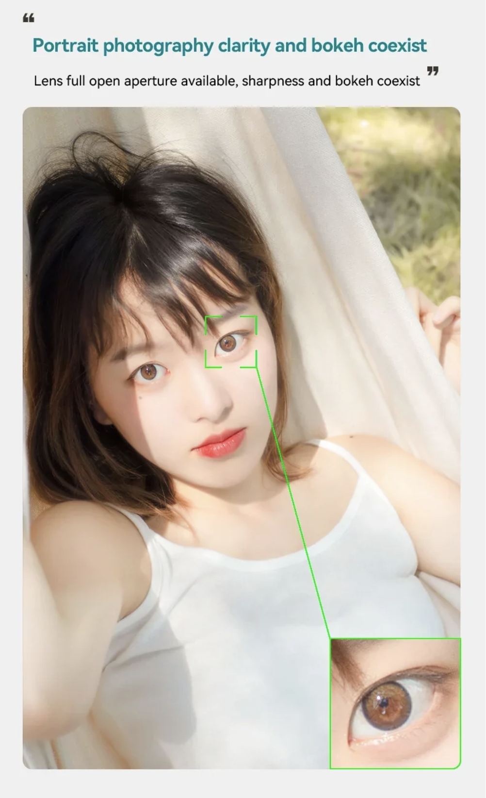 · รูรับแสงกว้าง F1.7: รูรับแสงที่กว้างช่วยให้เลนส์สามารถรับแสงได้ดีเยี่ยม ทำให้ถ่ายภาพในสภาพแสงน้อยได้อย่างมีประสิทธิภาพ และยังช่วยสร้างโบเก้ (ฉากหลังเบลอ) ที่สวยงามและนุ่มนวล