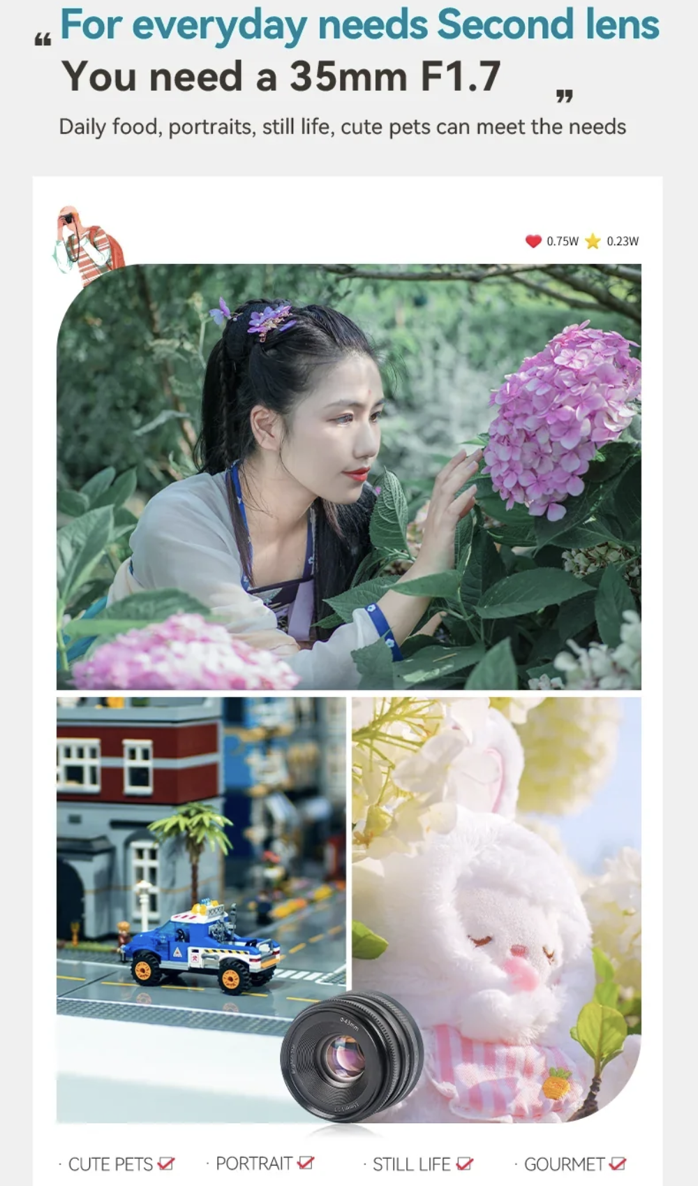 · ทางยาวโฟกัสที่ใช้งานได้หลากหลาย: ด้วยระยะ 35 มม. บนกล้อง APS-C (เทียบเท่า 52.5 มม. บน Full-Frame) และ 35 มม. บนกล้อง MFT (เทียบเท่า 70 มม. บน Full-Frame) ทำให้เลนส์นี้ให้มุมมองภาพที่เป็นธรรมชาติและสามารถใช้ได้กับหลากหลายสถานการณ์