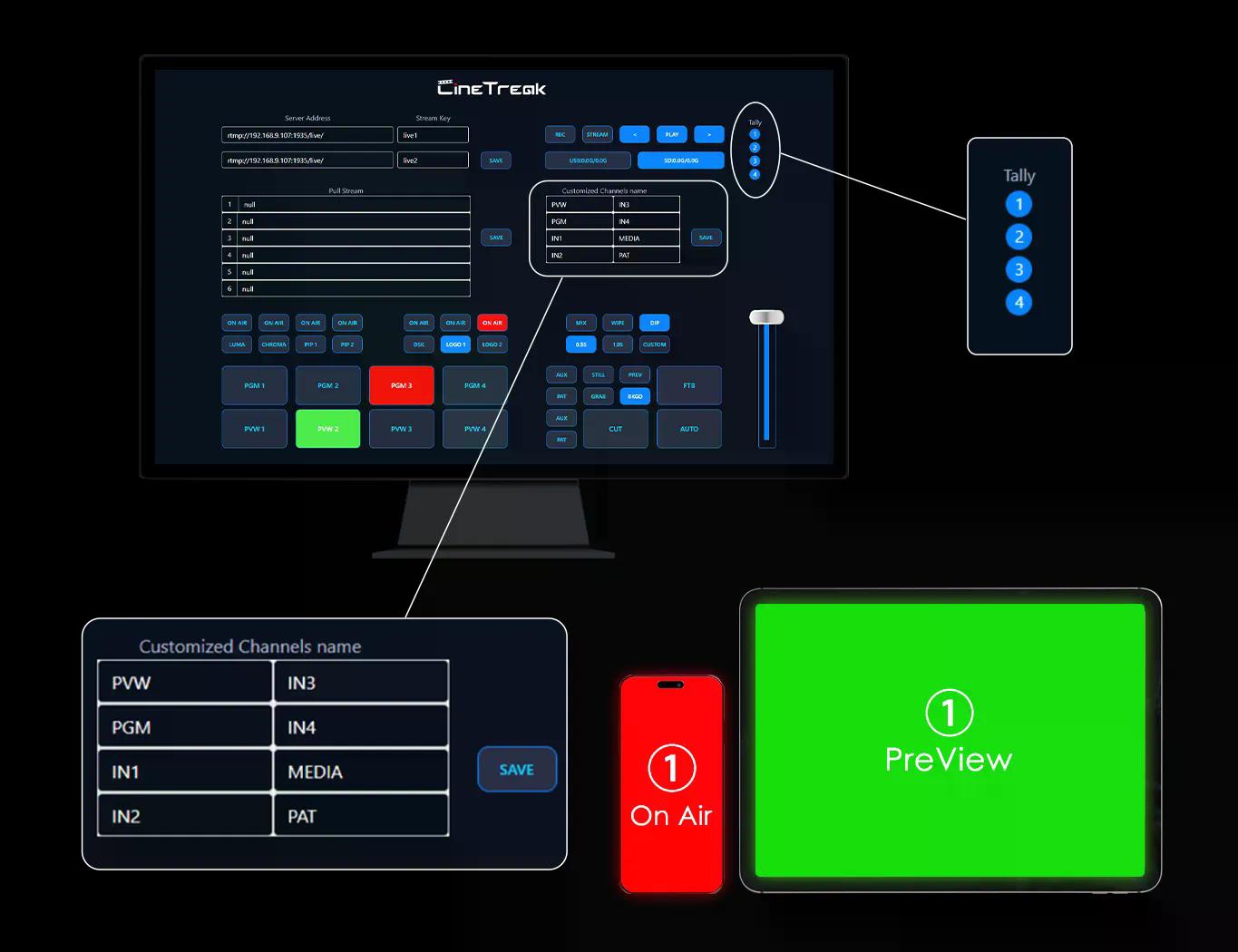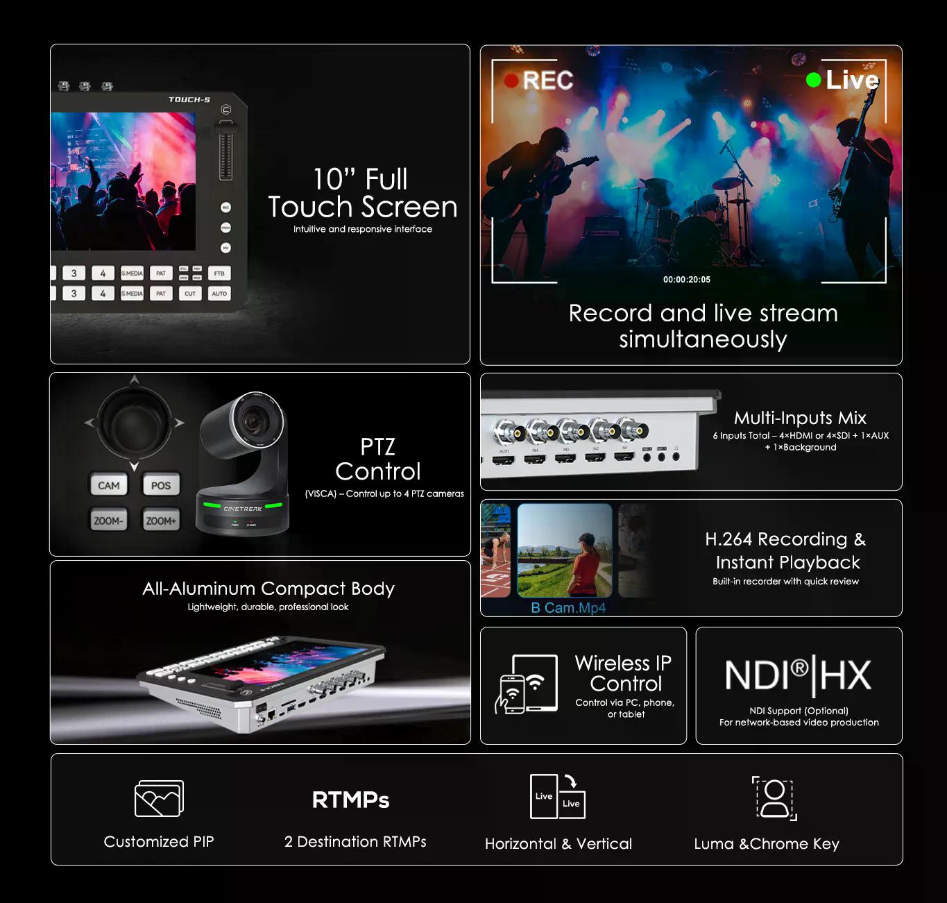 ・CineTreak TOUCH-S ไม่ได้เป็นแค่อุปกรณ์สลับภาพ แต่ยังมาพร้อมฟังก์ชันที่จำเป็นสำหรับการทำงาน Live Streaming ระดับมืออาชีพ