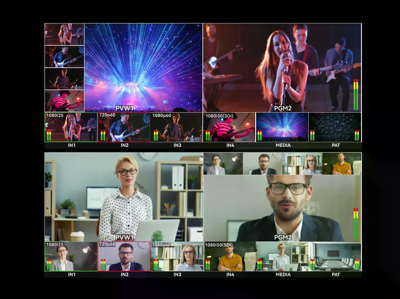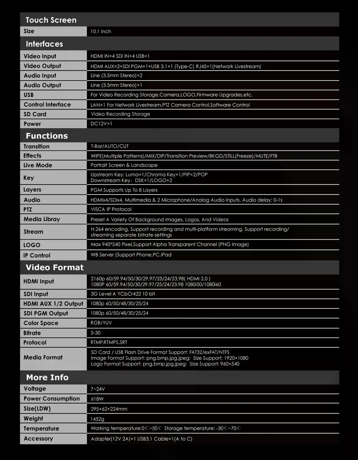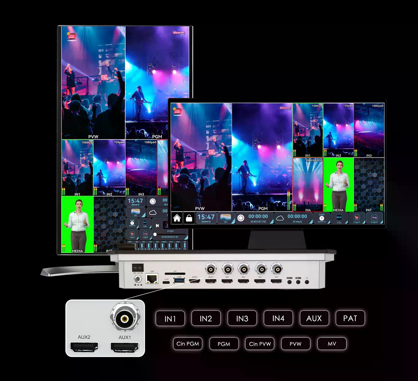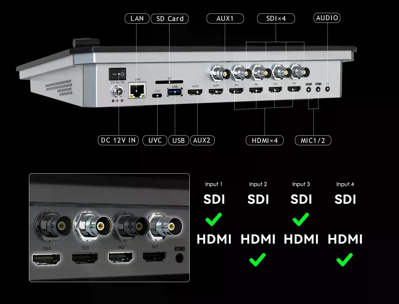 ・ช่องสัญญาณเข้า (Inputs) ถึง 8 ช่อง ประกอบด้วย HDMI 4 ช่อง และ SDI 4 ช่อง ทำให้สามารถเชื่อมต่ออุปกรณ์ได้หลากหลาย