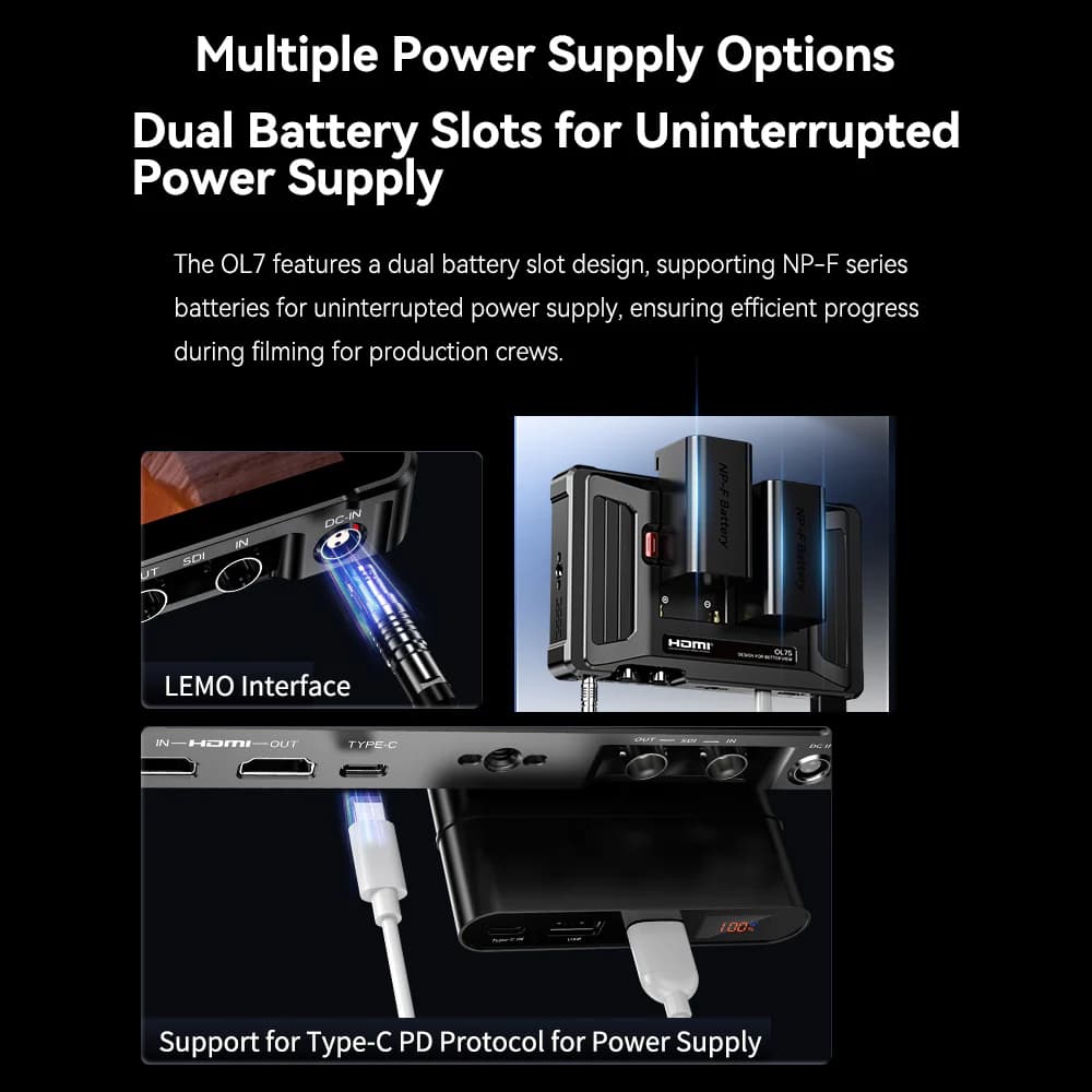 ・แหล่งพลังงานหลากหลาย ใช้แบตเตอรี่ Sony NP-F Series dual battery plate, USB-C PD 2.3 / 3.0