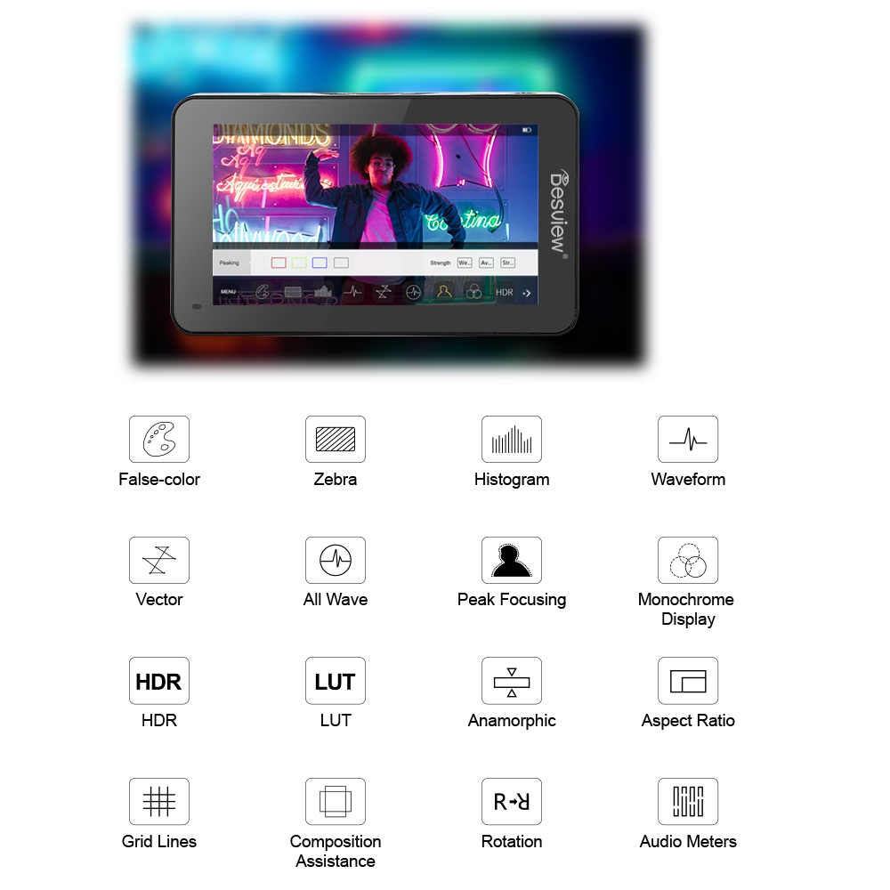 ・ฟังก์ชันระดับมืออาชีพ: รองรับ 3D LUT, Waveform, Vectorscope, Peaking Focus, Zebra, HDR PQ/HLG, การควบคุมผ่านระบบสัมผัสเต็มรูปแบบ