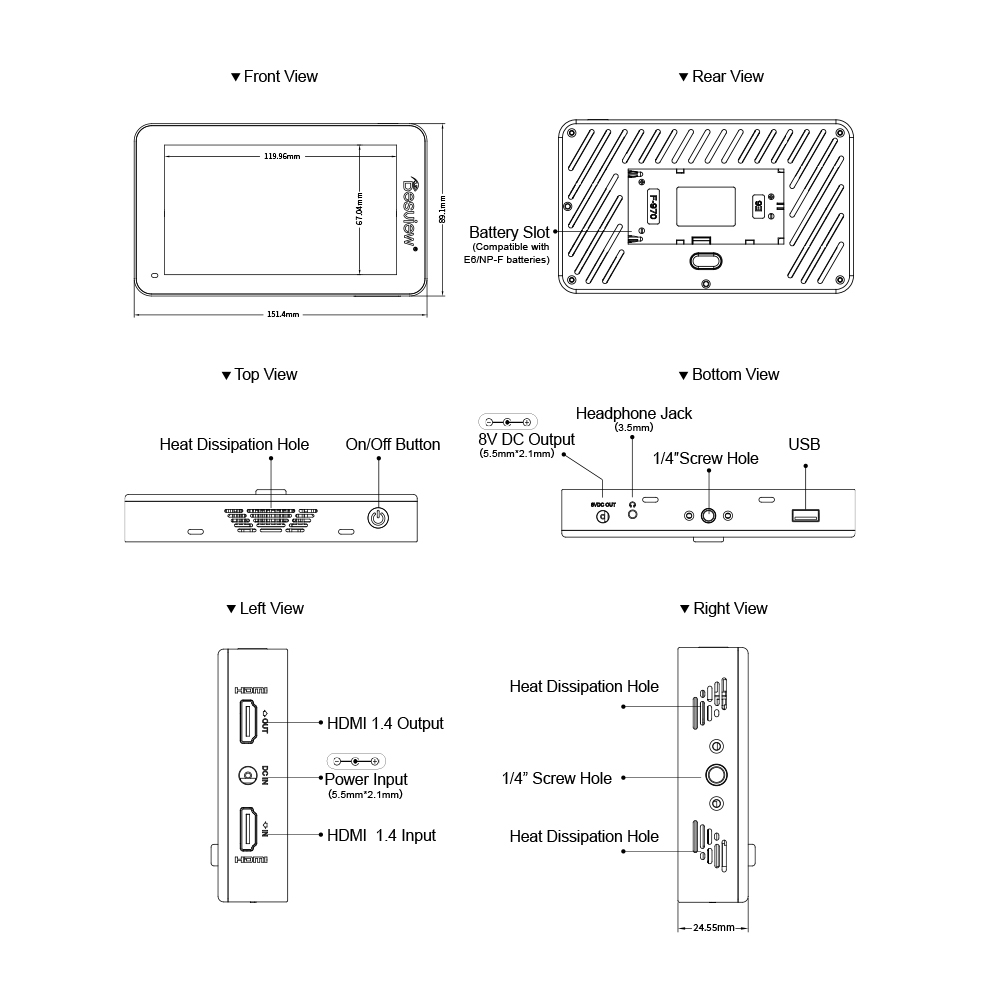 ・ระบบจ่ายไฟครบครัน: รองรับ Sony NP-F, Canon LP-E6, DC 7–24V และมีเอาต์พุต DC 8V สำหรับจ่ายไฟให้กล้อง
