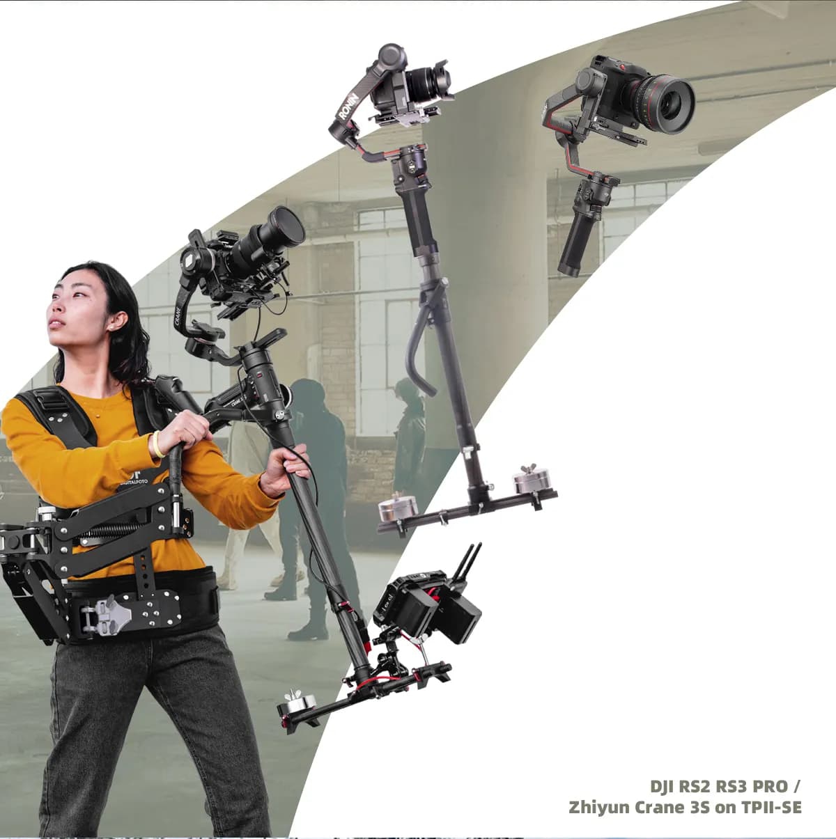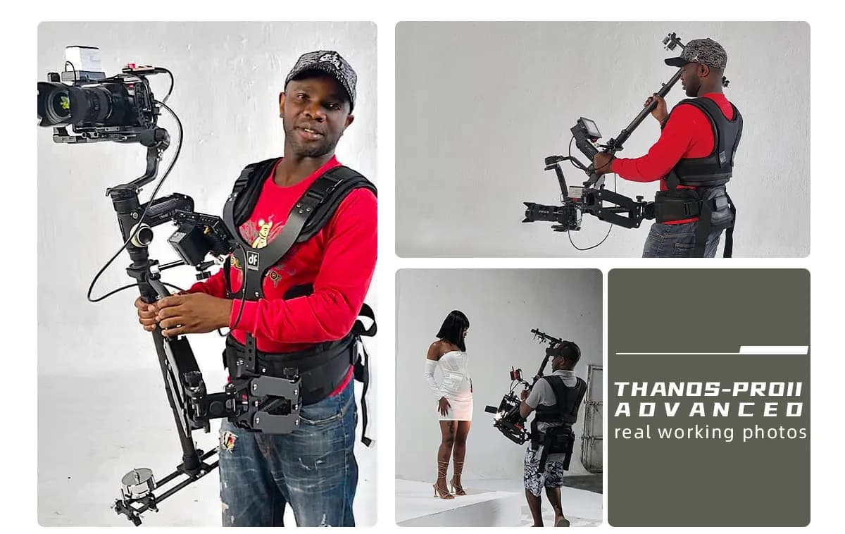 ・ชุดสายรัด (Vest), แขนสปริงแบบ Dual Arm, แขน-สลิดแบบปรับ Tilta-style ปรับเอียงหรือเลื่อนด้านข้างได้ — เคลื่อนไหวได้คล่องตัวทุกมุม