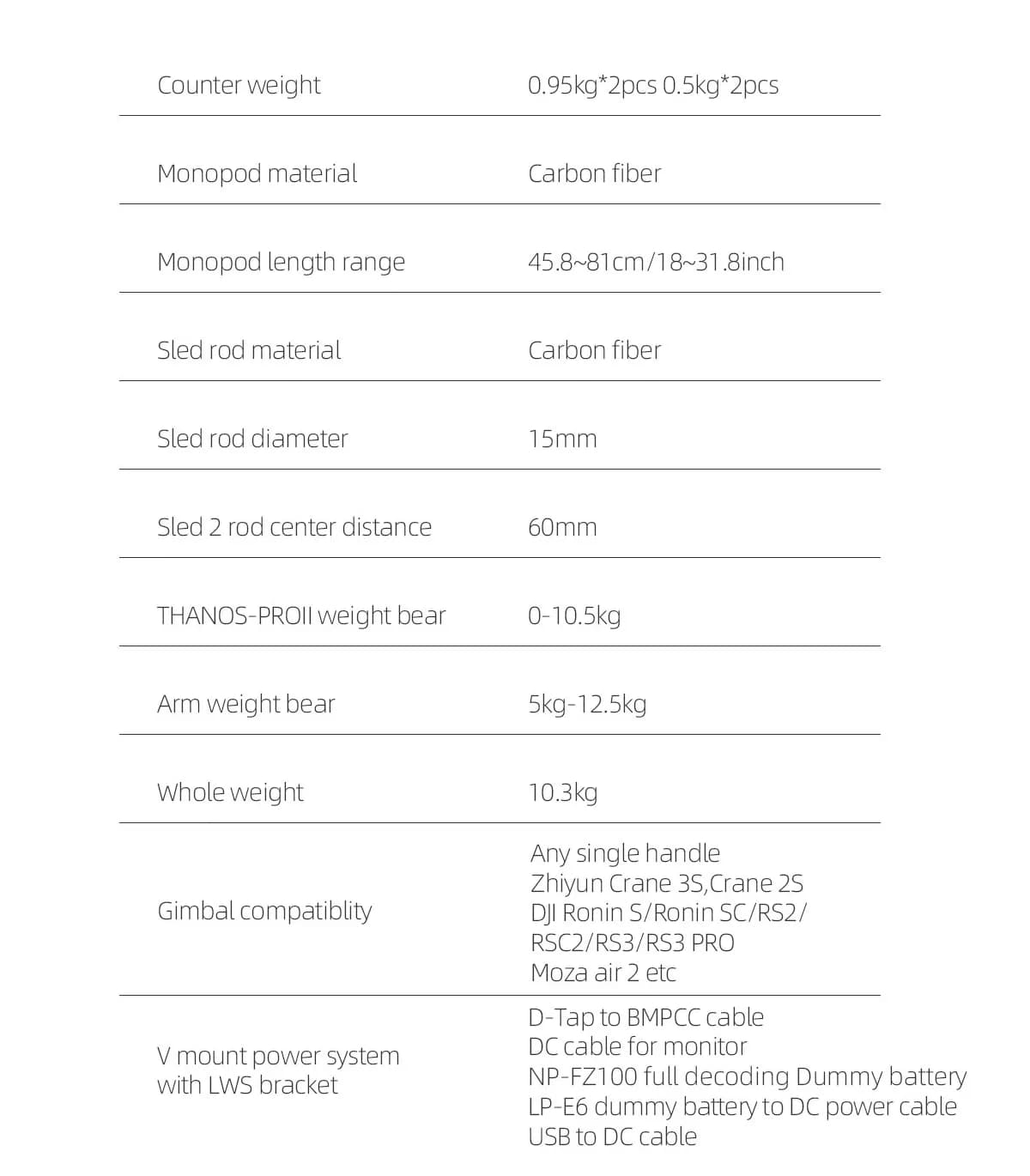 ・In the box : Vest, Monopod sled base, Dual arm, Carbon fiber monopod 45.8cm ~ 81cm, Counter weight 0.95kg2pcs, 0.5kg2pcs, Carbon fiber monopod bottom tighten screw and allen key, IRONMAN 11" magic arm, V mount power system with LWS bracket, Trini-slider, TP-BS01, PENDULUM-1, Carry case