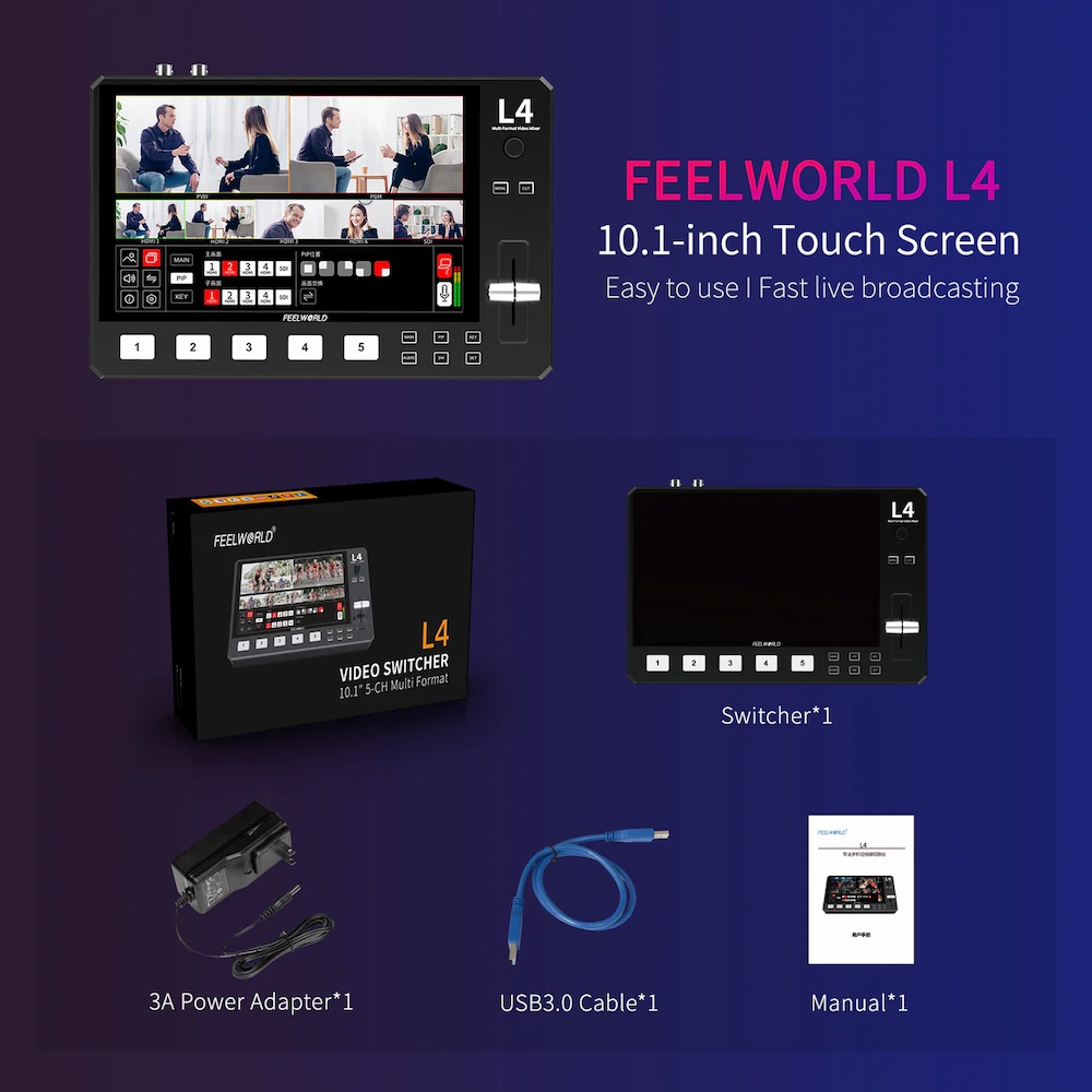 FEELWORLD L4 Multi-Camera Video Mixer Switcher 10.1"หน้าจอสัมผัส USB3.0 สตรีมมิ่ง ประกันศูนย์ไทย