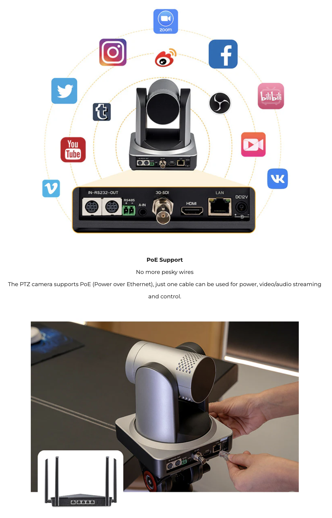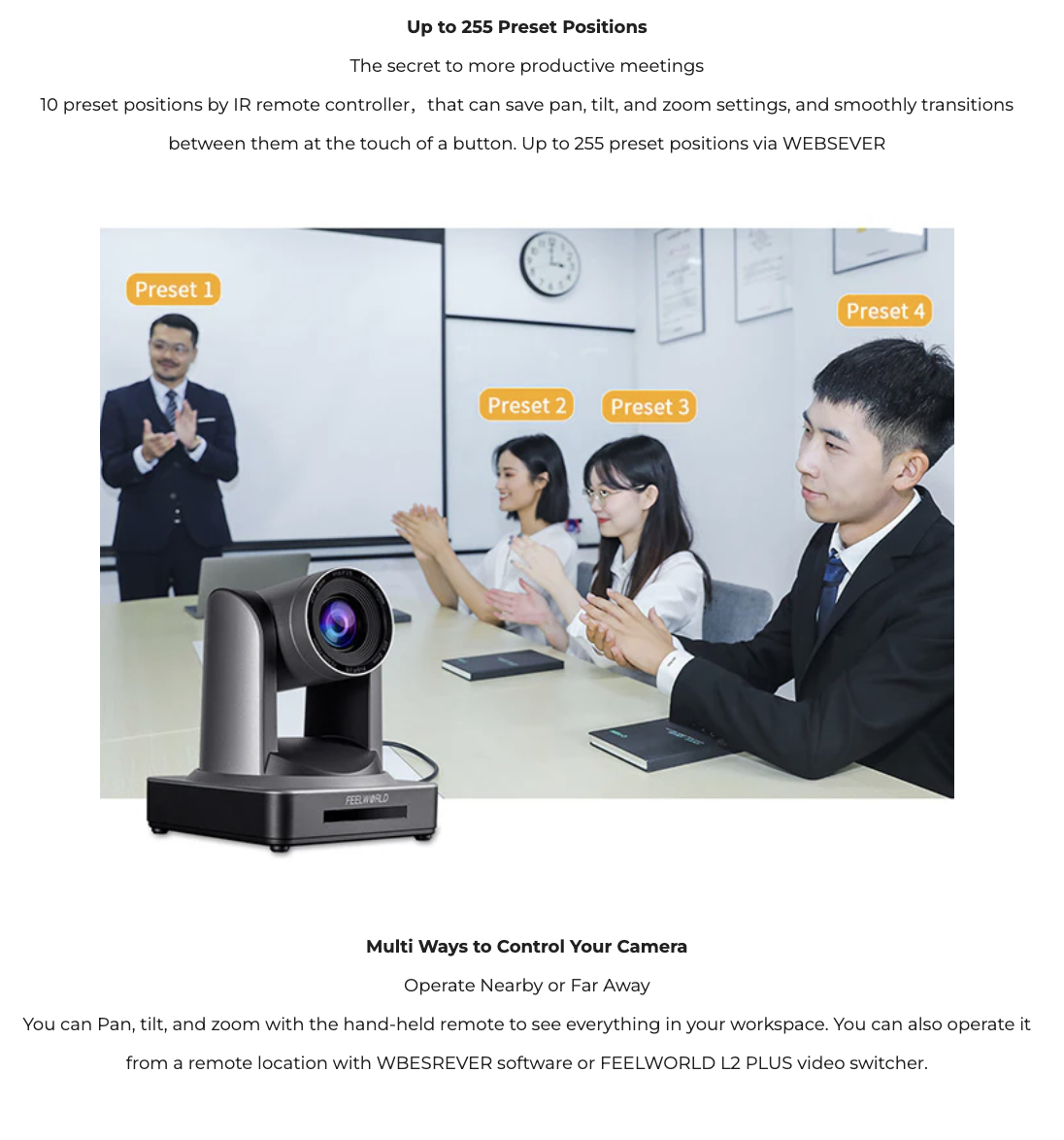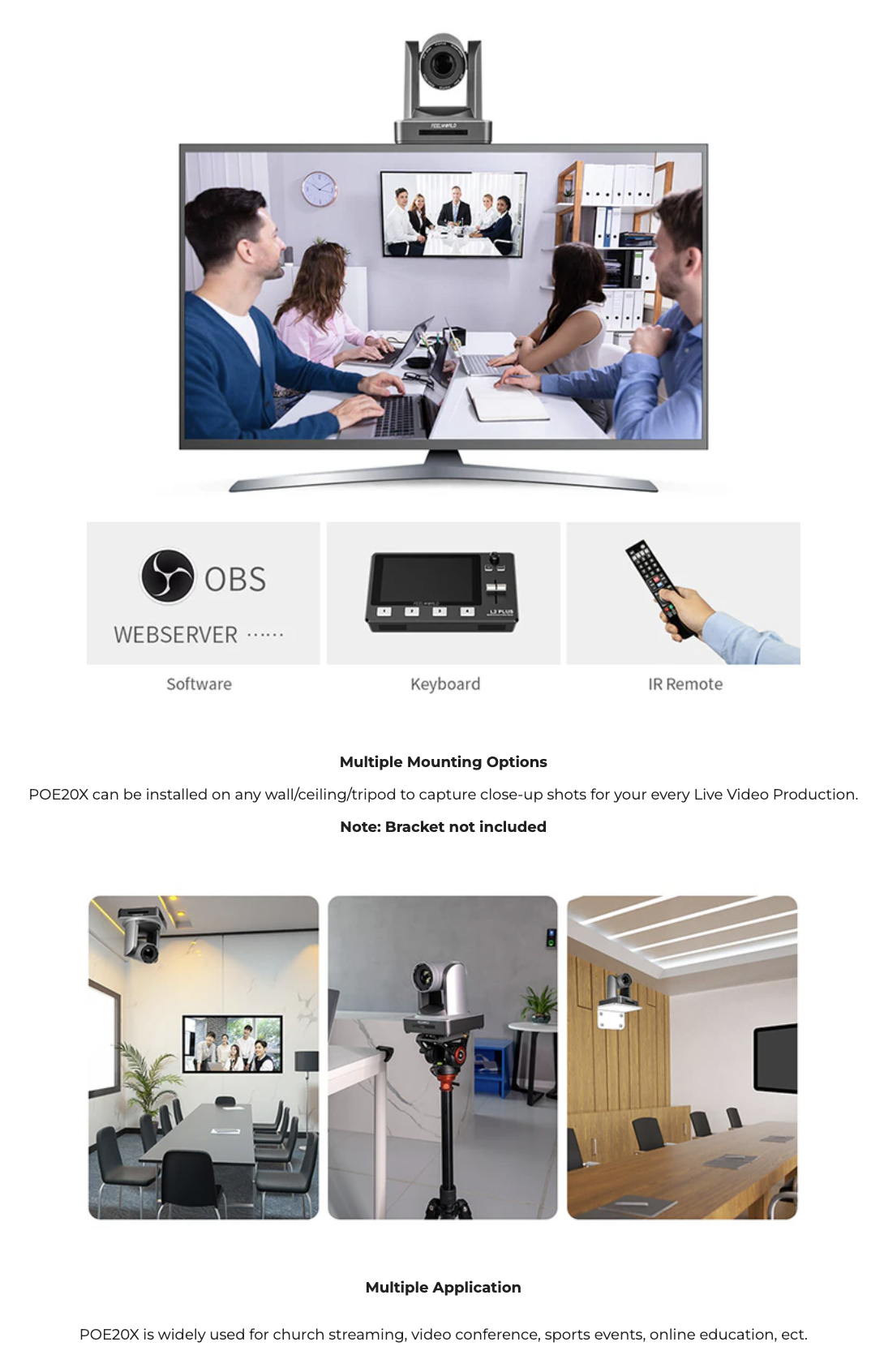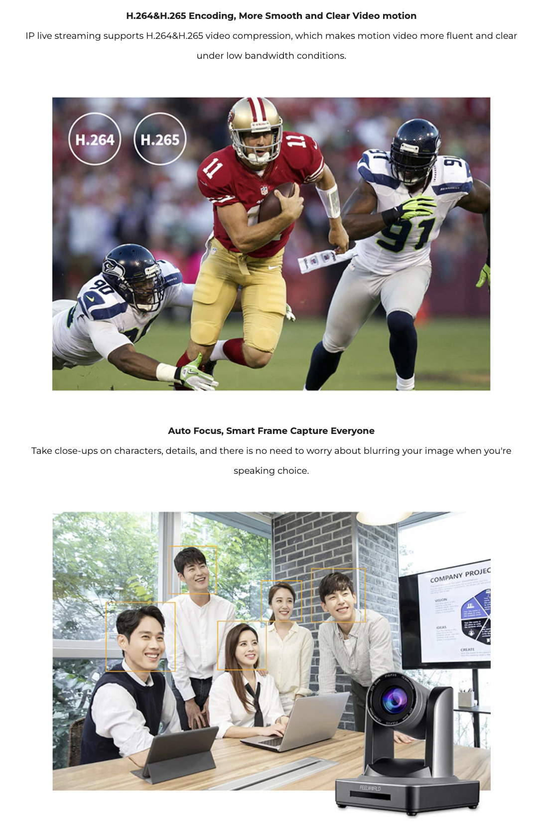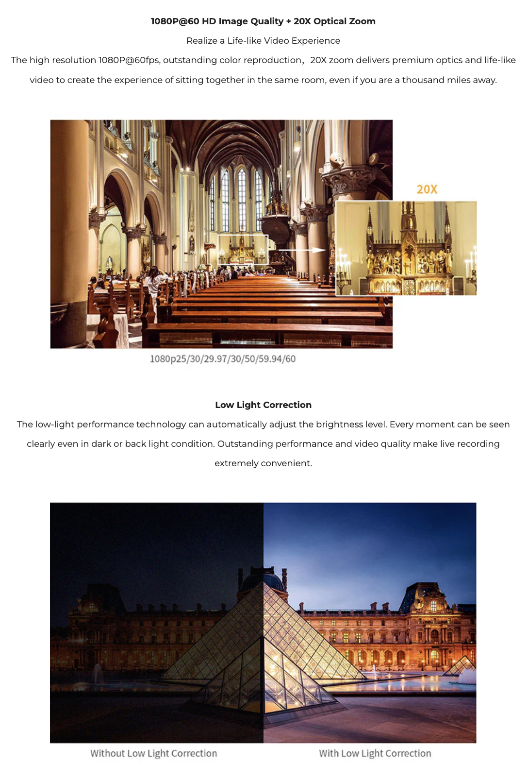 ・20X Optical Zoom & 1080p@60fps: ซูมแบบออปติคอล 20X กำลังสูง ให้ภาพคมชัดระดับ Full HD 1080p ที่ 60fps ทำให้วิดีโอคมชัดและเคลื่อนไหวได้อย่างราบรื่น เหมาะสำหรับห้องขนาดใหญ่และกิจกรรมที่ต้องการความละเอียดสูง