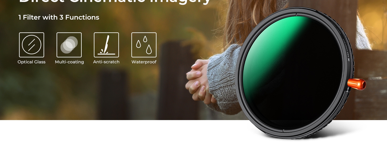 ・ฟิลเตอร์เดียวรวม 3 ฟังก์ชัน ได้แก่ Black Mist 1/4 + CPL และ Variable ND 2-32 เบลอเนียน ลดแสงสะท้อน ปรับแสงตามต้องการ