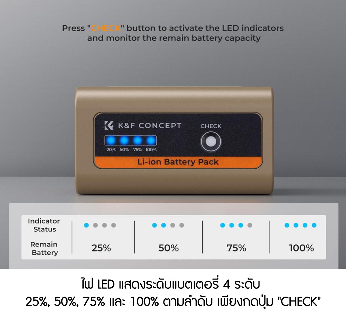 ・ไฟ LED แสดงระดับแบตเตอรี่ 4 ระดับ เพียงกดปุ่ม "CHECK"