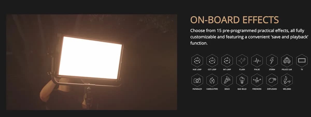 ・มีโหมดแสงและเอฟเฟกต์ในตัว 15 โหมด เช่น Hue Loop, CCT Loop, INT Loop, Flash, Pluse, Storm, Police Car, TV, Paparazzi, Candle/File, Disco, Bad Bulb, Firework, Explosion, Welding