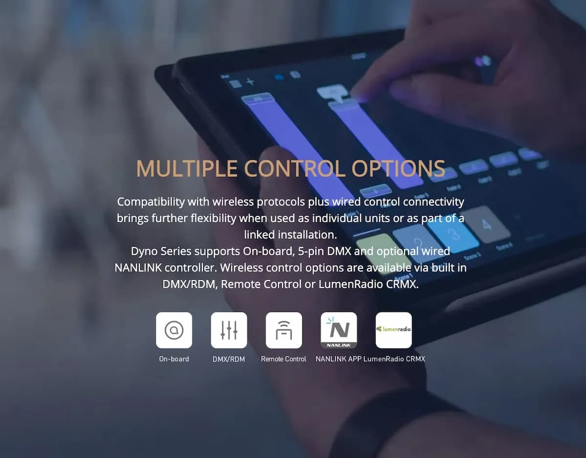 ・รองรับการควบคุมหลายช่องทาง เช่น On-board, Remote Contorl, NANLINK APP, DMX/RDM และ LumenRadio CRMX