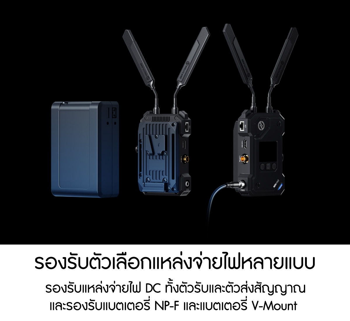 ・รองรับตัวเลือกแหล่งจ่ายไฟหลายแบบ: อะแดปเตอร์จ่ายไฟ DC (ล็อค) + แบตเตอรี่ NP-F สำหรับตัวส่ง, อะแดปเตอร์จ่ายไฟ DC (ล็อค) + เพลตแบตเตอรี่ V-Mount สำหรับตัวรับ