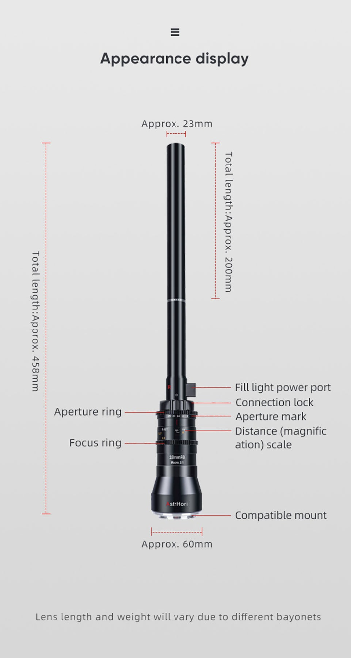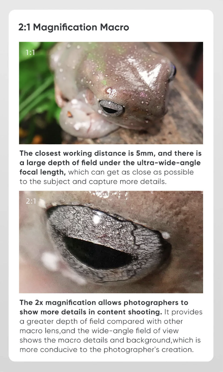 · อัตราขยายมาโคร 2 เท่า (2X Magnification): ถ่ายทอดรายละเอียดของวัตถุขนาดเล็กได้ใหญ่กว่าขนาดจริงถึง 2 เท่า (2:1) เหมาะสำหรับงานมาโครระดับโปร