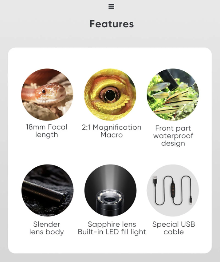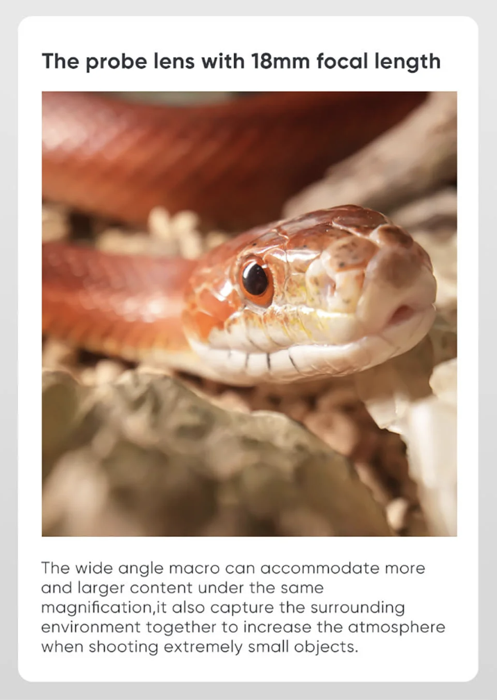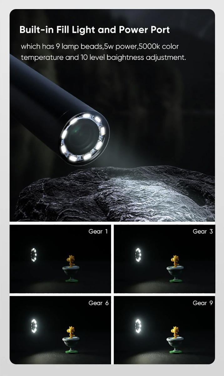 · ไฟ LED ในตัว (Built-in LED Fill Light): มีไฟ LED ในตัวที่ส่วนปลายเลนส์ พร้อมปรับความสว่างได้หลายระดับ (สูงสุด 10 ระดับ) ช่วยให้คุณส่องสว่างวัตถุขนาดเล็กได้อย่างแม่นยำแม้ในสภาพแสงน้อย