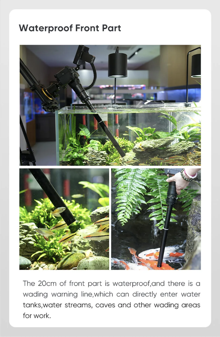 · ส่วนหัวเลนส์กันน้ำ (Waterproof Front Element): ส่วนปลายของกระบอกเลนส์ (ประมาณ 25 ซม.) สามารถกันน้ำได้ ให้คุณถ่ายภาพในน้ำ ลำธาร หรือของเหลวได้อย่างมั่นใจ โดยไม่ต้องกังวล