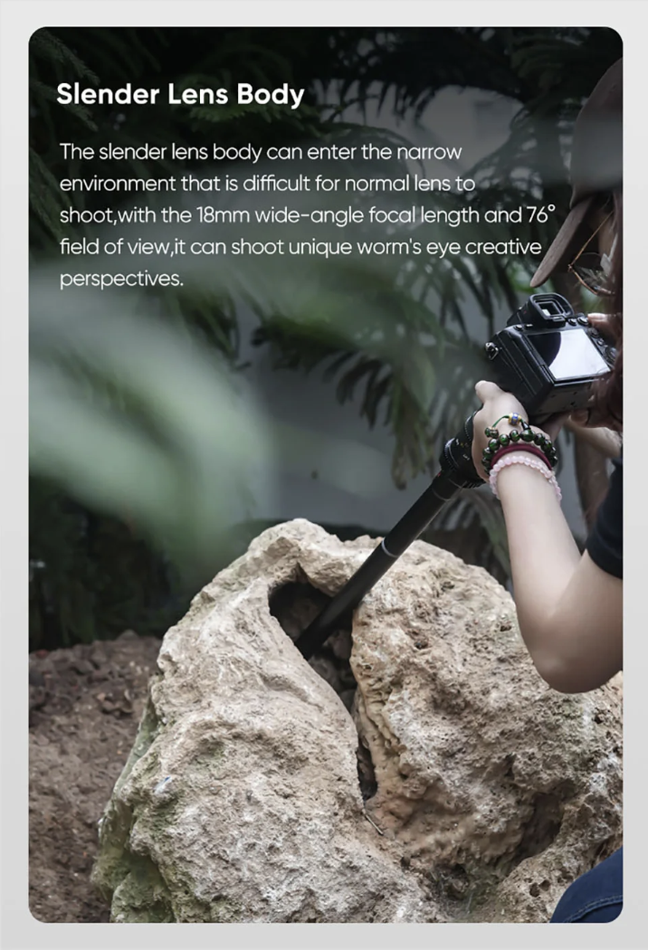 · ดีไซน์ทรงกระบอกเรียวยาว (Slender Probe Design): กระบอกเลนส์ยาวและเรียวบาง ช่วยให้คุณสอดเลนส์เข้าไปในพื้นที่แคบ ๆ หรือมุมที่เลนส์ทั่วไปเข้าไม่ถึง เพื่อสร้างภาพมุมมองแปลกใหม่แบบ "หนอนมอง" (Worm's Eye View) หรือมุมมองจากด้านใน