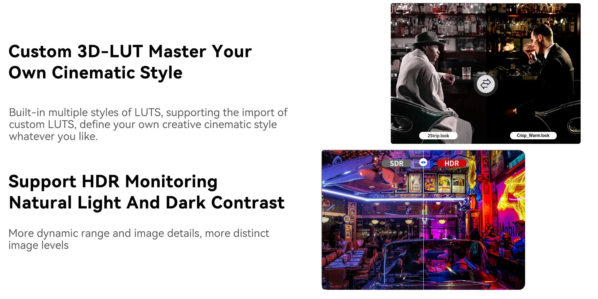 ・ฟังก์ชันช่วยด้านภาพ Waveform, Vectorscope, Histogram, Focus Peaking, Zebra, False Color, 3D LUTs, HDR