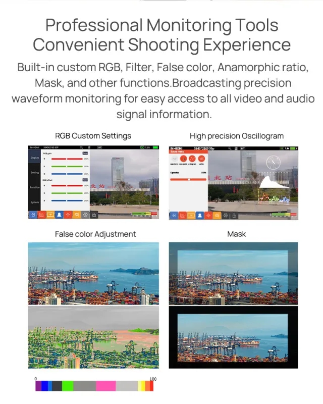 ・ฟีเจอร์การตรวจสอบภาพครบครัน รวมถึง waveform, vectorscope, RGB parade, false color, focus peaking, anamorphic ratio, masking, histogram และอื่น ๆ เพื่อการควบคุมภาพที่ละเอียด