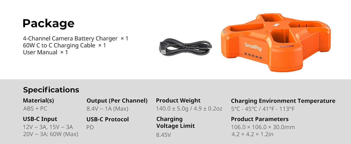 ・In the box : LP-E6 4-Channel Camera Battery Charger x 1, 60W C to C Charging Cable x1, User Manual x 1, Guarantee Card x 1