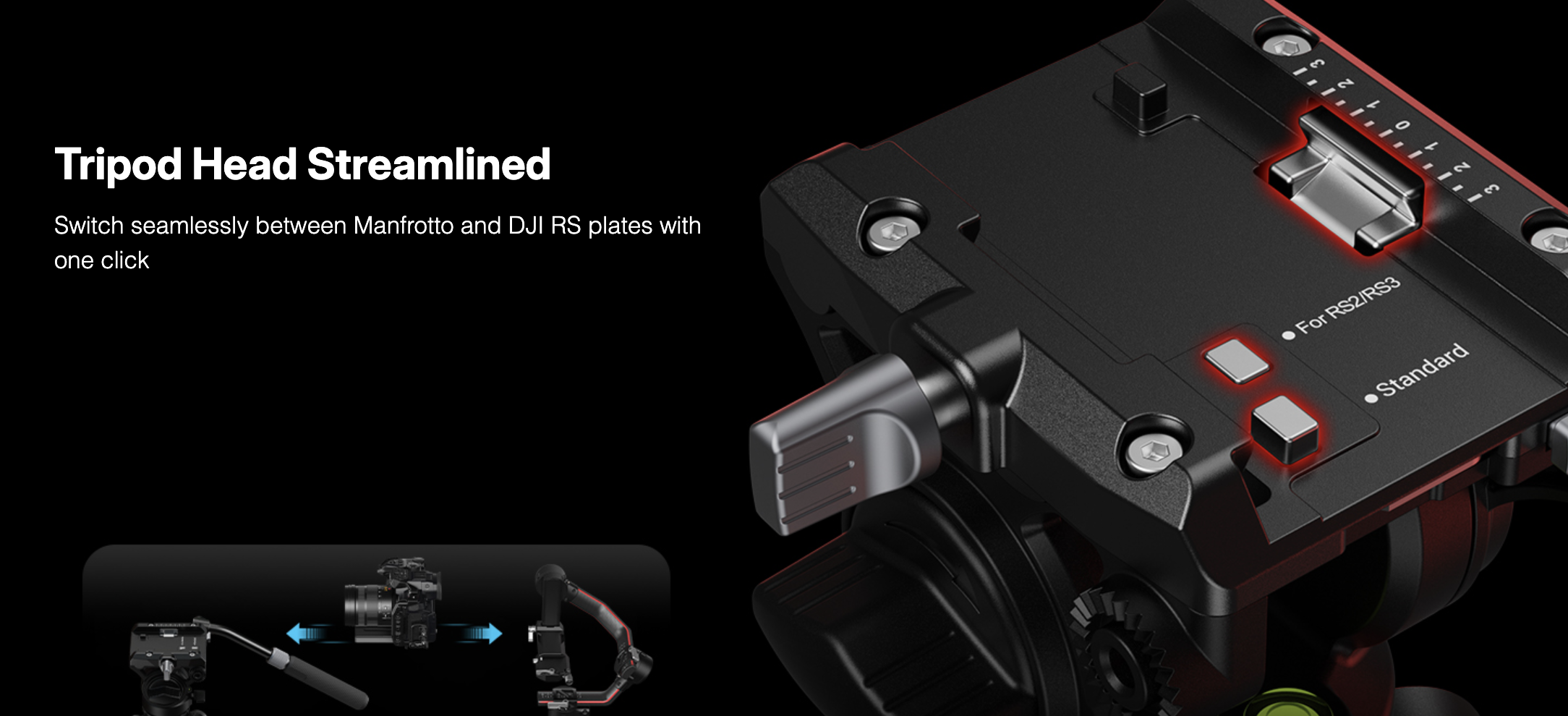 ・หัววิดีโอ Hydraulic Fluid Head มี counterbalance 4‑step (สูงสุด 6 กก.), ควบคุม tilt/pan แบบ stepless และระบบ Touch‑and‑Go plate รองรับแผ่น 501 หรือ DJI RS ได้อย่างรวดเร็ว