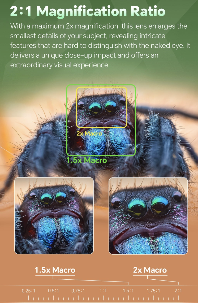 · เลนส์มาโครที่ให้กำลังขยายสูง 2X (2:1) – แสดงผลวัตถุได้ใหญ่กว่าชีวิตจริงสองเท่า