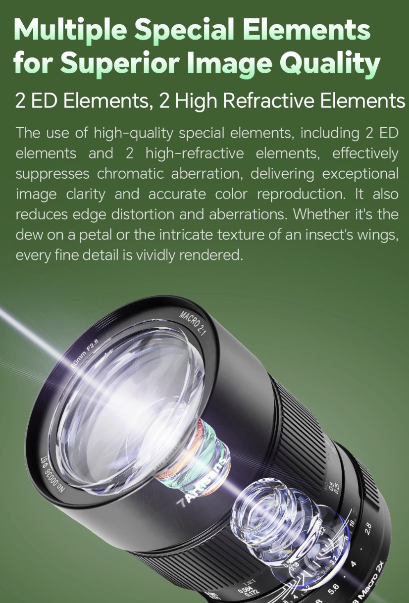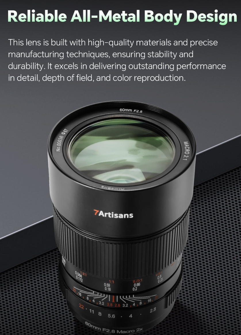 · ตัวเลนส์โลหะคุณภาพสูง งานประกอบแข็งแรงทนทาน (All-Metal Body) ออกแบบมาให้รองรับการใช้งานหนักสำหรับช่างภาพมาโครโดยเฉพาะ