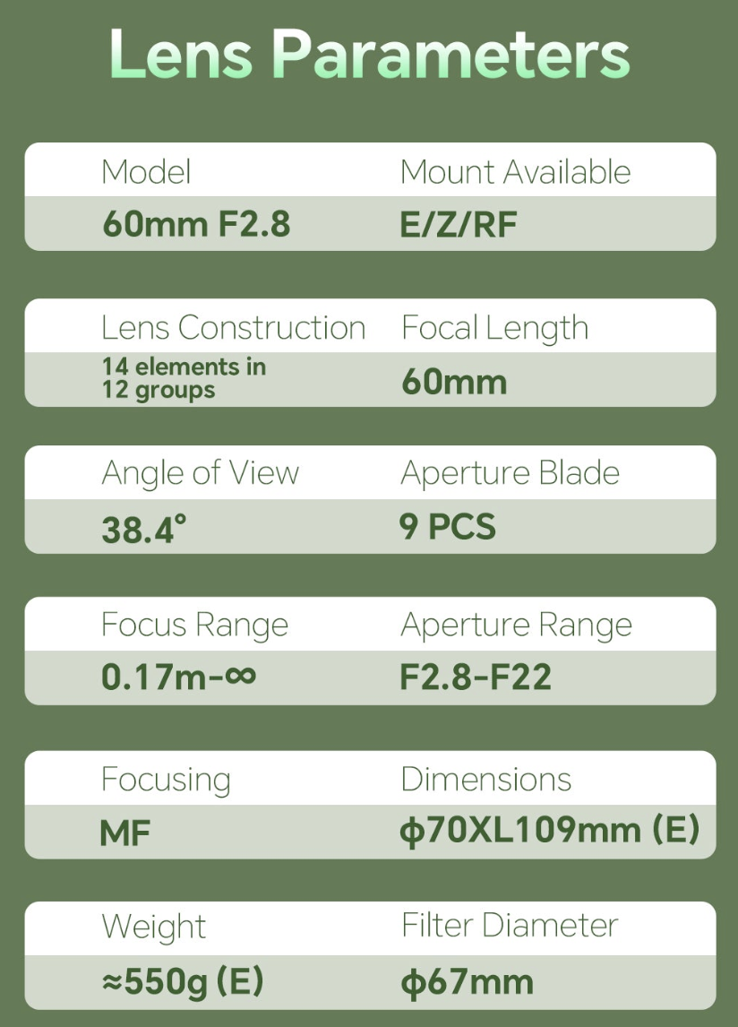· ทางยาวโฟกัส: 60mm (Full Frame)