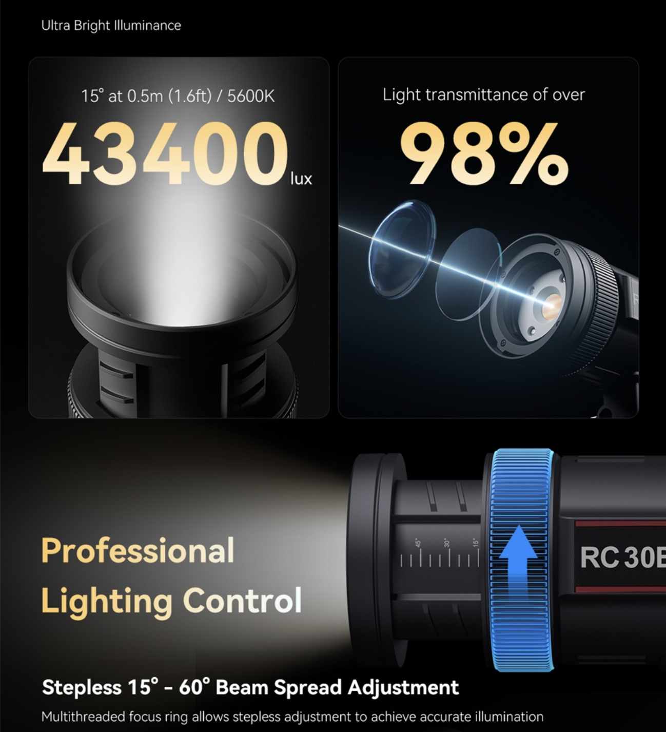 ・ซูมได้และสว่างเป็นพิเศษ: สามารถปรับมุมลำแสงได้แบบไร้ขั้น (Stepless) จาก 15° (แสงพุ่ง) ถึง 60° (แสงกระจาย) ทำให้คุณควบคุมรูปแบบแสงได้อย่างแม่นยำ ให้ความสว่างสูงสุดถึง 43,400 Lux ที่ระยะ 0.5 เมตร (ที่ 15° และ 5600K)