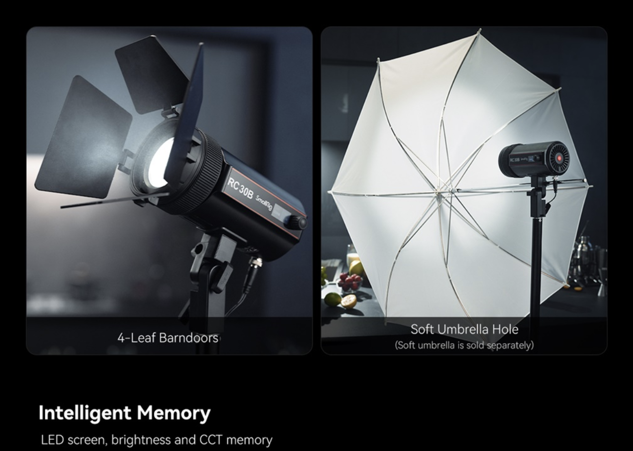 ・ควบคุมแสงได้อย่างง่ายดาย: มาพร้อมกับ 4-Leaf Barndoor (แผ่นบังแสง 4 ทิศทาง) เพื่อควบคุมทิศทางแสง และมี ช่องใส่ร่ม (Umbrella Hole) ในตัวสำหรับการต่อ Softbox/ร่ม เพื่อให้แสงนุ่มนวล