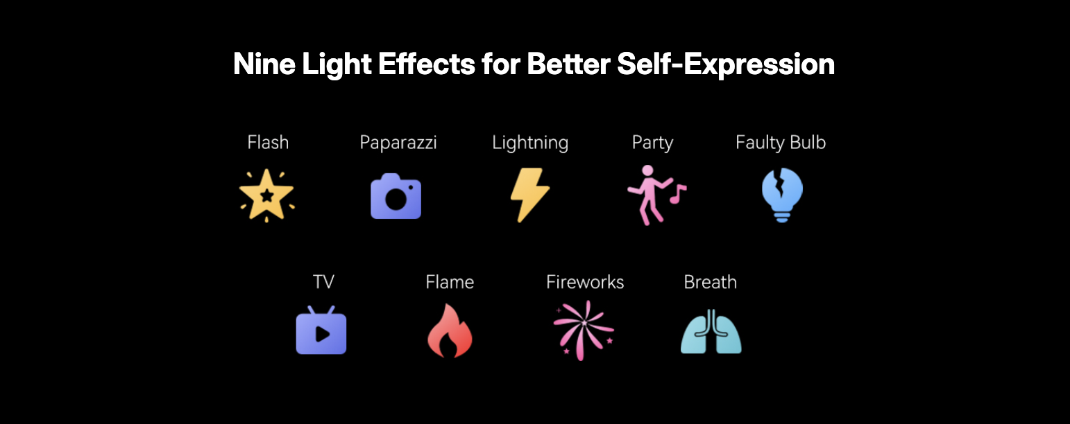 ・เอฟเฟกต์สร้างสรรค์: มาพร้อม 9 โหมดเอฟเฟกต์แสง ในตัว (เช่น Paparazzi, Lightning, TV, Firework) เพื่อเพิ่มลูกเล่นให้กับงานของคุณ
