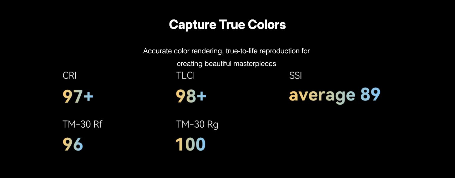 ・ความแม่นยำของสีสูงสุด: ค่า CRI 97+ และ TLCI 98+ รับประกันสีที่ถูกต้องแม่นยำและเป็นธรรมชาติ