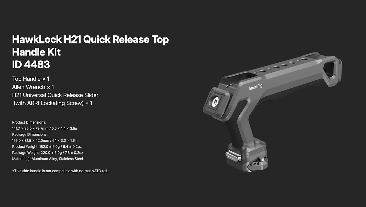 ・In the box : Top Handle × 1, Allen Wrench × 1, H21 Universal Quick Release Slider (with ARRI Lockating Screw) × 1