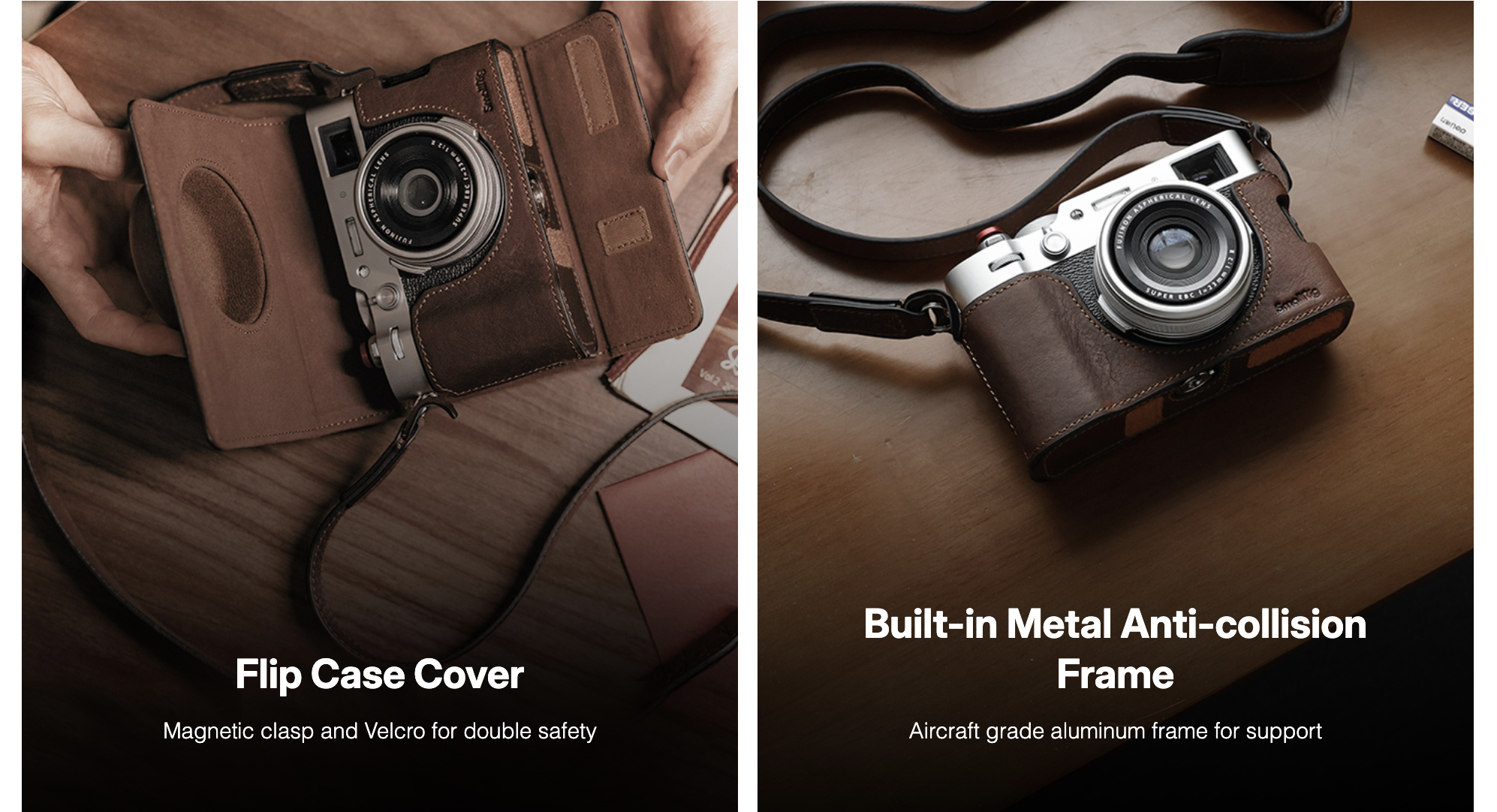 ・ดีไซน์พรีเมียมด้วยหนังแท้คุณภาพสูง ใช้วัสดุหนังแท้ให้ผิวสัมผัสดี สวยงาม เข้ากับสไตล์คลาสสิกของ X100VI