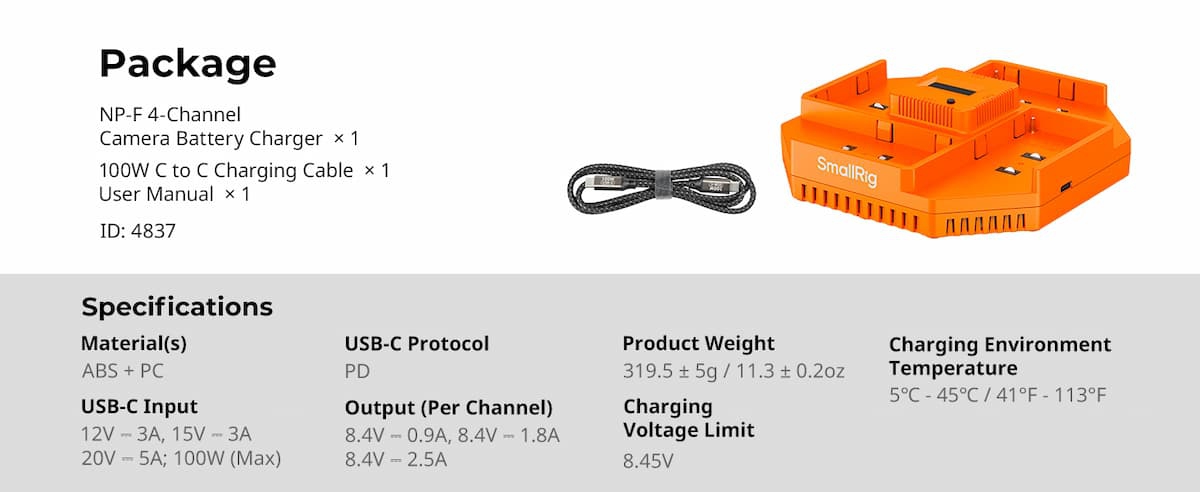 ・In the box : SmallRig L-Series/NP-F 4-Channel Camera Battery Charger x 1, USB-C to USB-C Cable x 1, User Manual x 1