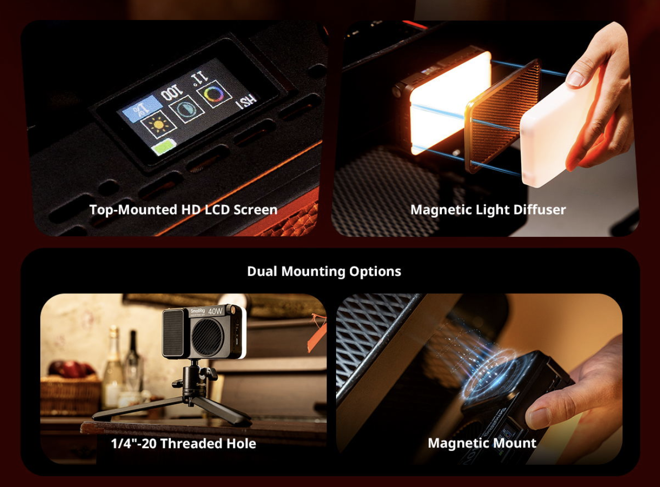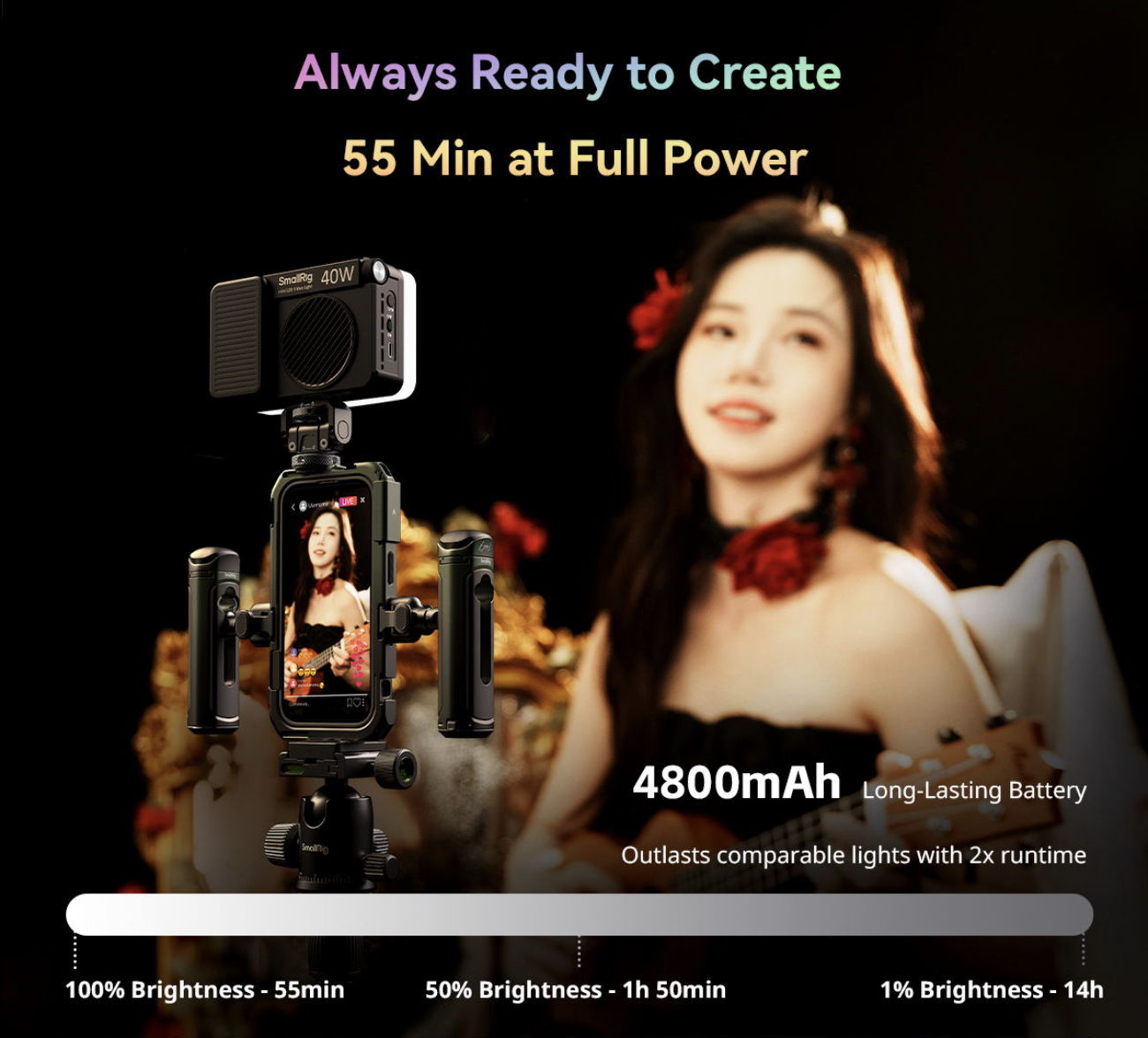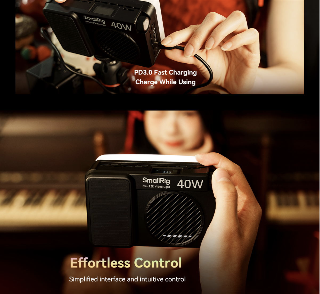 ・พลังสูงในขนาดพกพา (40W Pocket Power) ให้กำลังไฟสูงสุด 40W ด้วยความสว่าง 4,670Lux ที่ 1m (ที่ 5600K Daylight) และ แบตเตอรี่ในตัว 4800mAh ใช้งานได้นาน 55 นาทีที่ความสว่าง 100% พร้อมรองรับการชาร์จเร็ว USB-C PD
