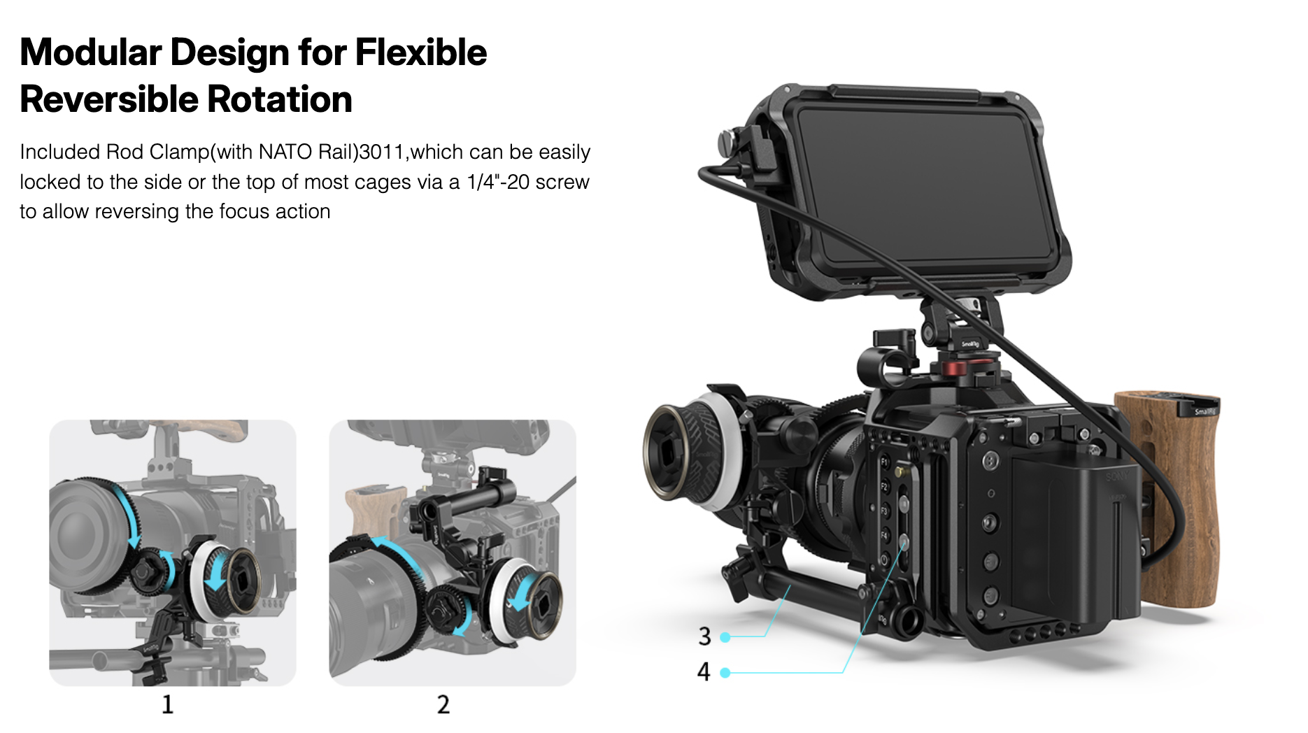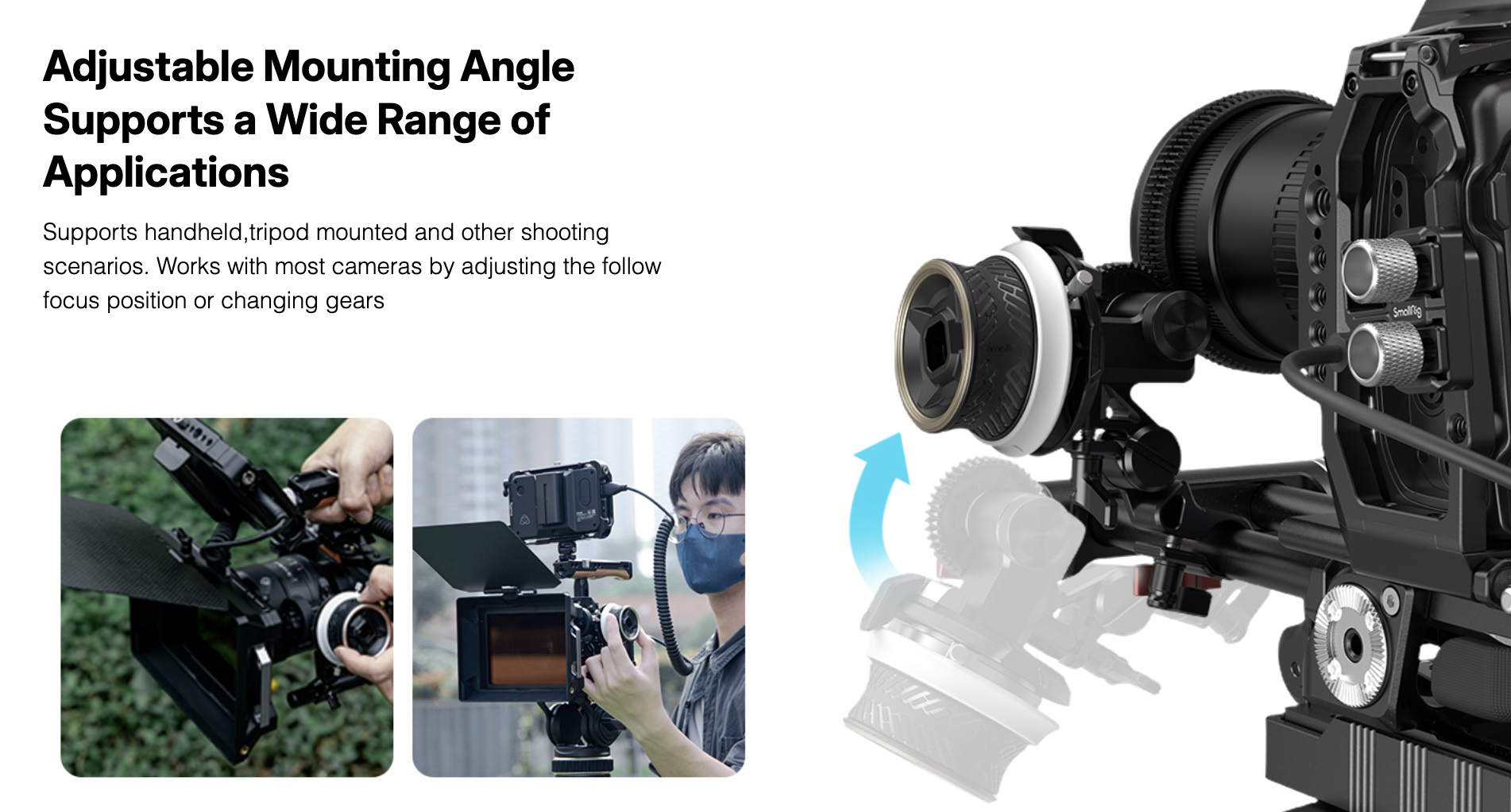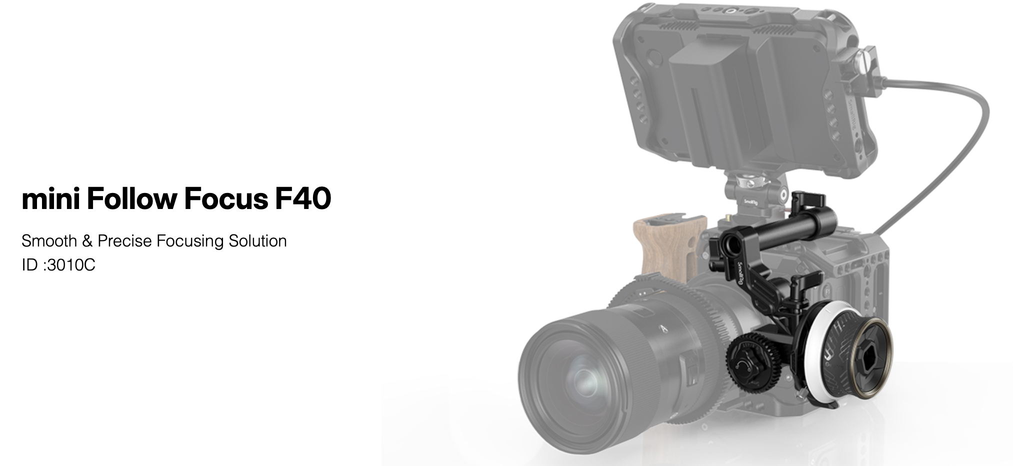 ・In the box : SmallRig F40 Mini Follow Focus, แคลมป์ราง 15 มม. พร้อมราง NATO, เกียร์ 0.8 MOD / 43T, ราง 15 มม. ยาว 3.9 นิ้ว, แหวนเกียร์แบบ Snap-on, แผ่นมาร์คกิ้ง, ประแจหกเหลี่ยม, กล่องเก็บอุปกรณ์