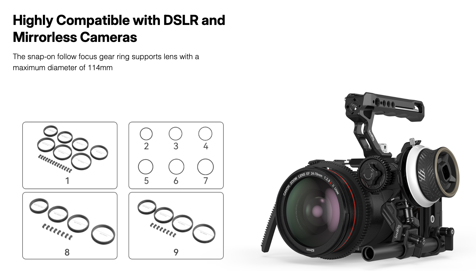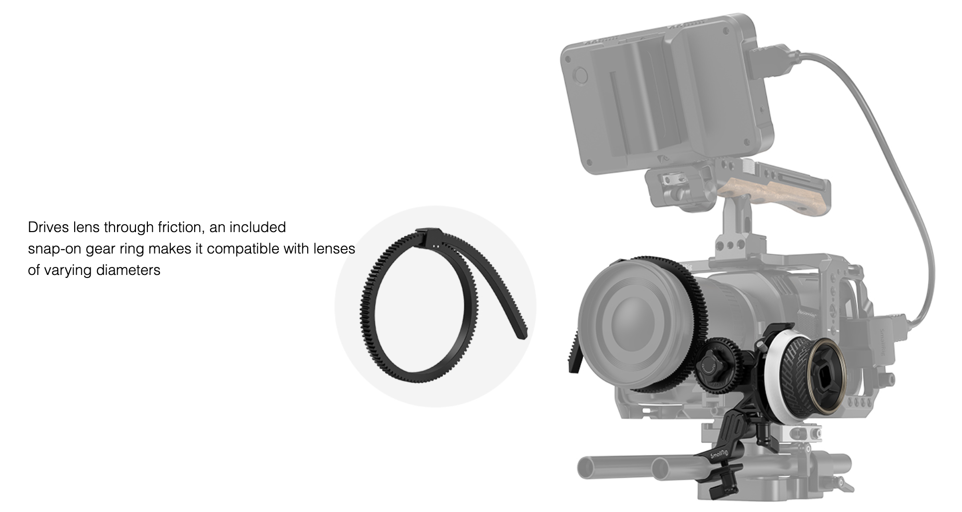 ・รองรับเลนส์หลากหลายขนาด: สามารถใช้งานกับเลนส์ที่มีเส้นผ่านศูนย์กลางสูงสุดถึง 114 มม. ด้วยแหวนเกียร์แบบ Snap-on
